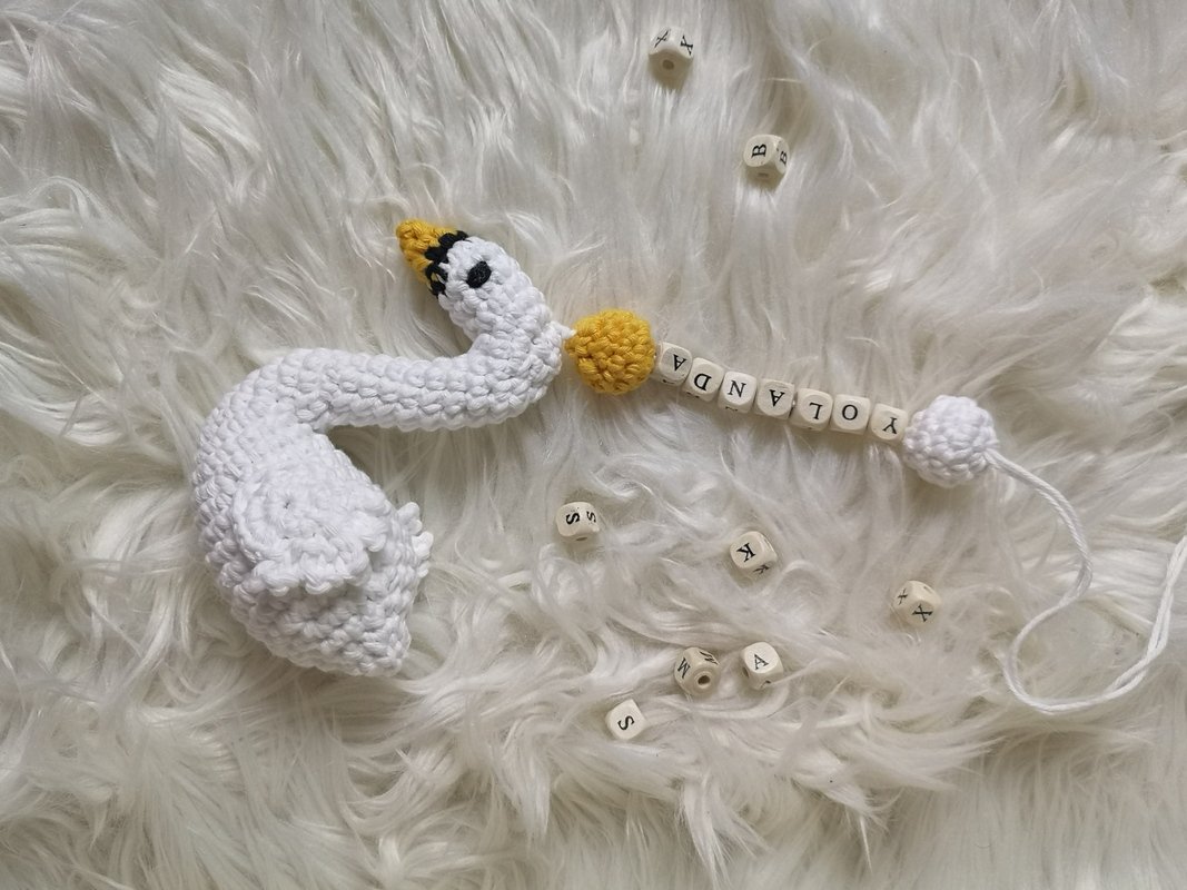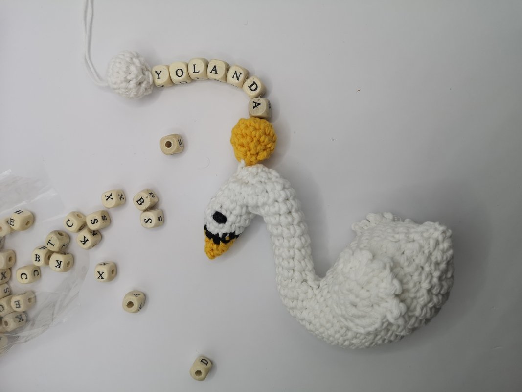 The swan is perfect as a pendant for bags, mobiles, pacifier chains (made of thinner yarn), for the Christmas tree... Provided with a rattle ball, it is also perfect as a pendant for the bracket above the infant car seat.