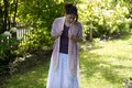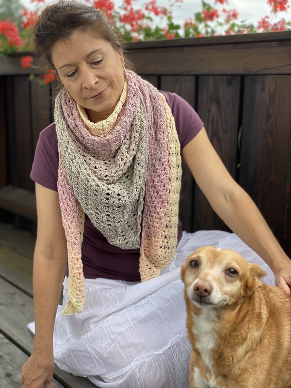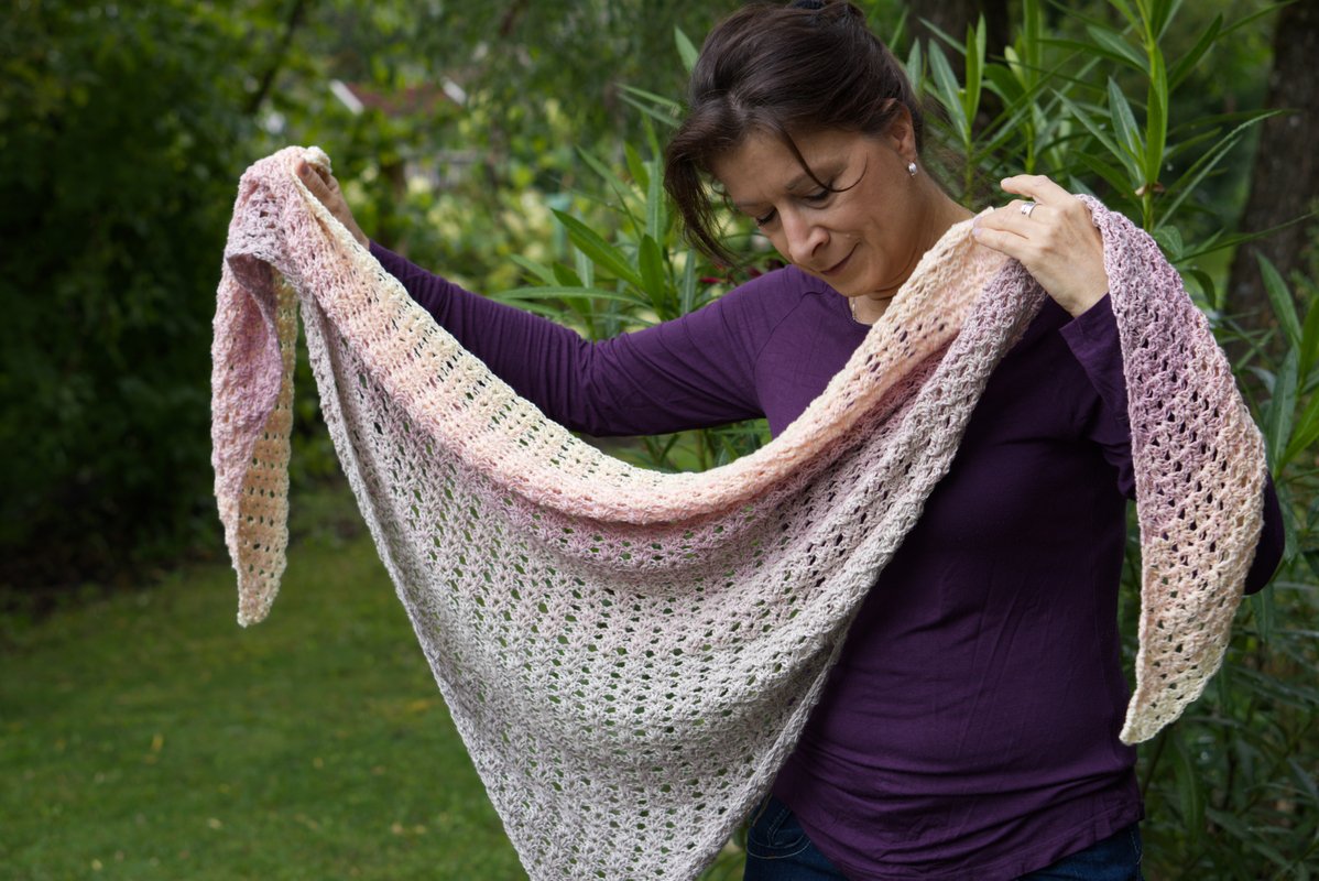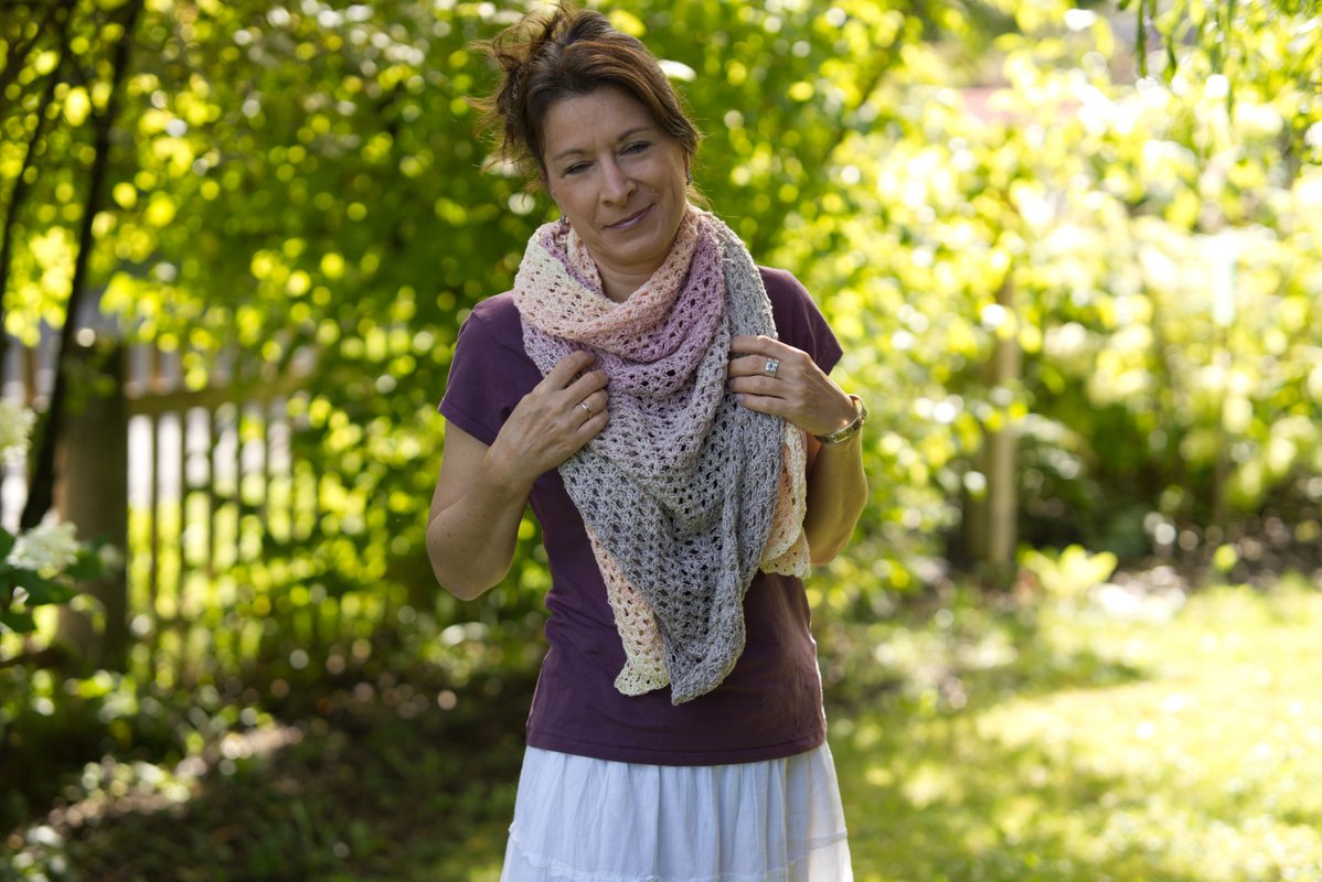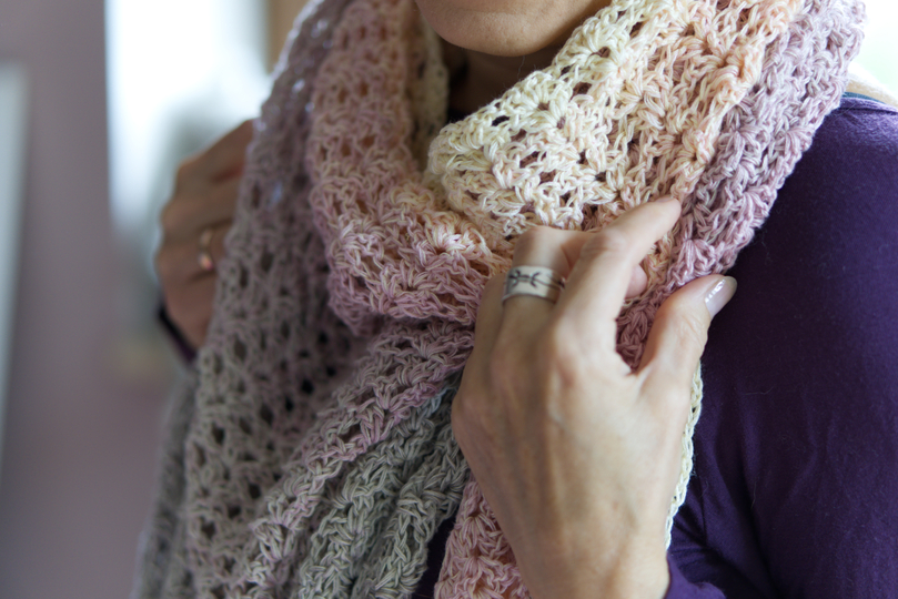LOLA is a beautiful airy shawl, perfect for any season, with a soft gradient colour change from gray to light rosé.