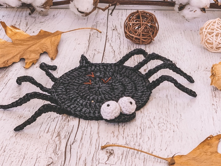 This crochet pattern contains instruction with step-by-step on how to make coaster spider with raffia.