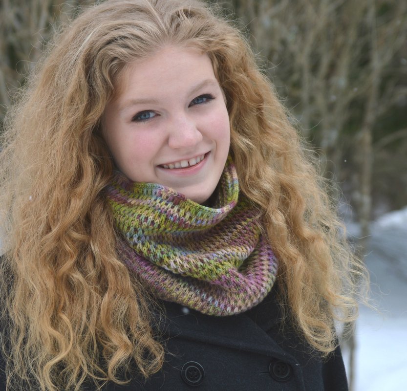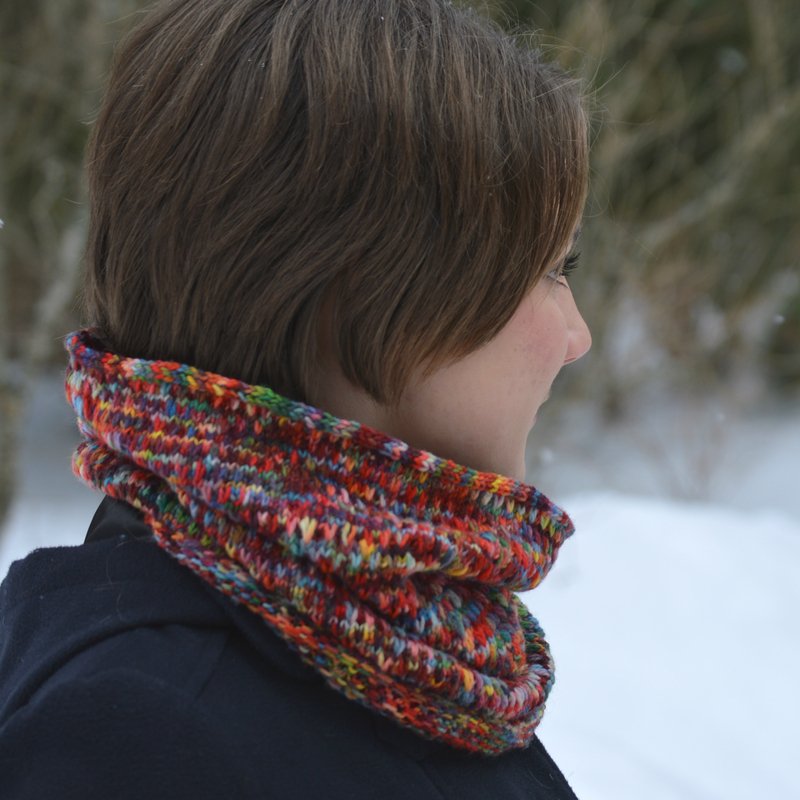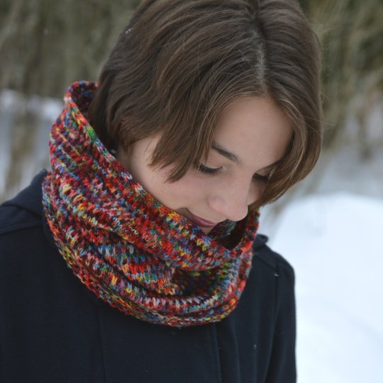 This cowl pattern answers these questions. The textured stitch pattern adds warmth without extra bulk and breaks up color pooling you often find in hand dyed yarns.
