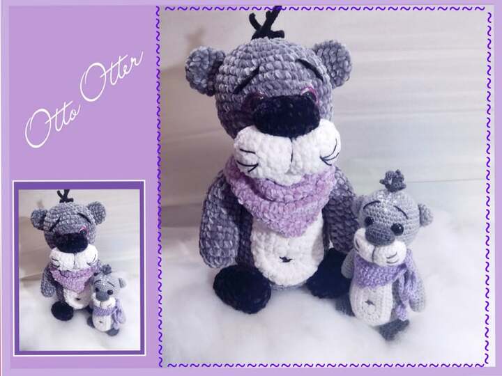 Ich habe Otto ~ Otter 1x mit Woll Butt Versailles und einer Nadelstärke von 2,0 und 1x mit Alison &Mae Velvet Specials und einer Nadelstärke von 3,5 gehäkelt. Der große Otter hat bei mir eine Größe von ca. 30 cm und der kleine Otter eine Größe von ca. 16 cm.