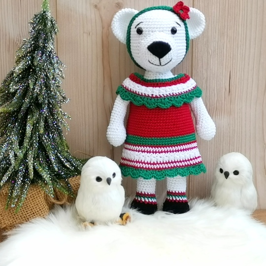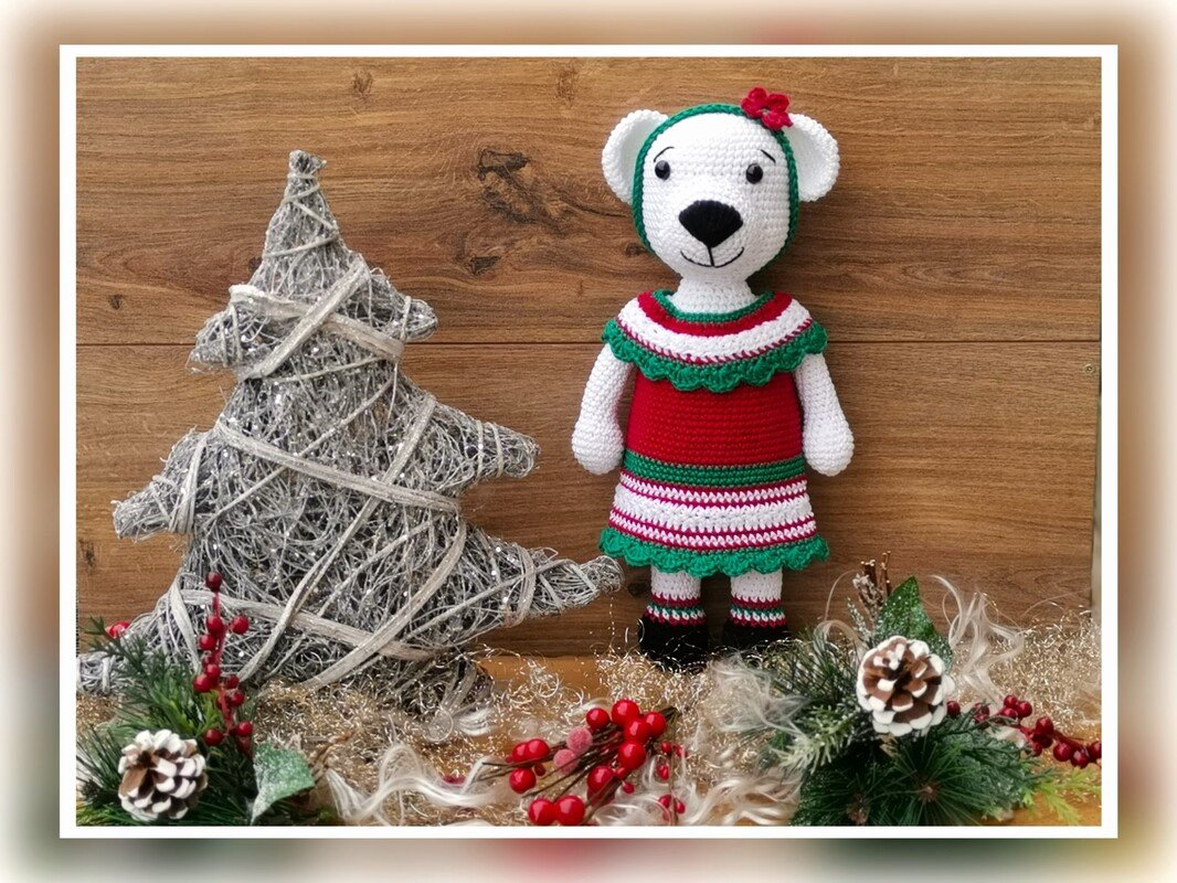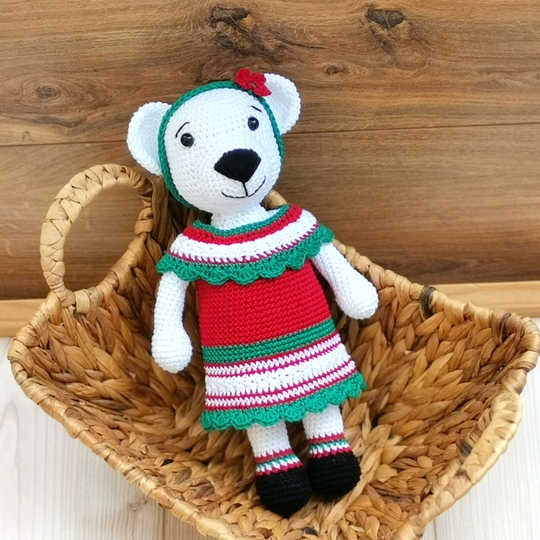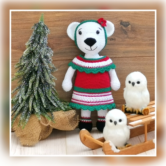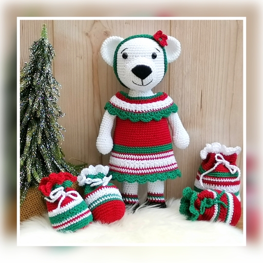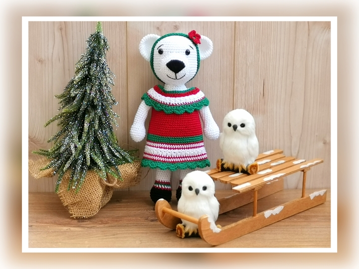 This beautiful polar bear girl is called Polly. She is already looking forward to christmas and wears a cute festive dress which is also included in the pattern (24 pages).
