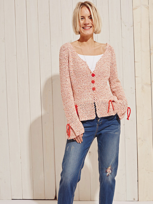 Fast ein bisschen wie Chanel! Diese hübsche Jacke ist vielseitig tragbar. Lässig im Schnitt ist sie ganz einfach im Stäbchenmuster gehäkelt. Schößchen und die die Ärmel haben jeweilt eine tiefe Kellerfalte. Diese werden entweder mit kontrastierenden oder gleichfarbigen Bändern am Ende betont. Die Jacke ist leicht tailliert und macht eine gute Figur. Die Vorderteile mit V-Ausschnitt werden erst unterhalb dieses geknöpft, welches die Jacke sehr nonchalant aussehen lässt. Mit festen Maschen und Picots umhäkelt werden die Verschulsskanten und der Ausschnitt zusätzlich betont. Das melierte Garn ergibt verhäkelt eine Tweedoptik. Gehäkelt wird mit Nadel Nr 4 und Garn von Lana Grossa. Die Anleitung gilt für die Größen 36, 38, 40 unnd 42.