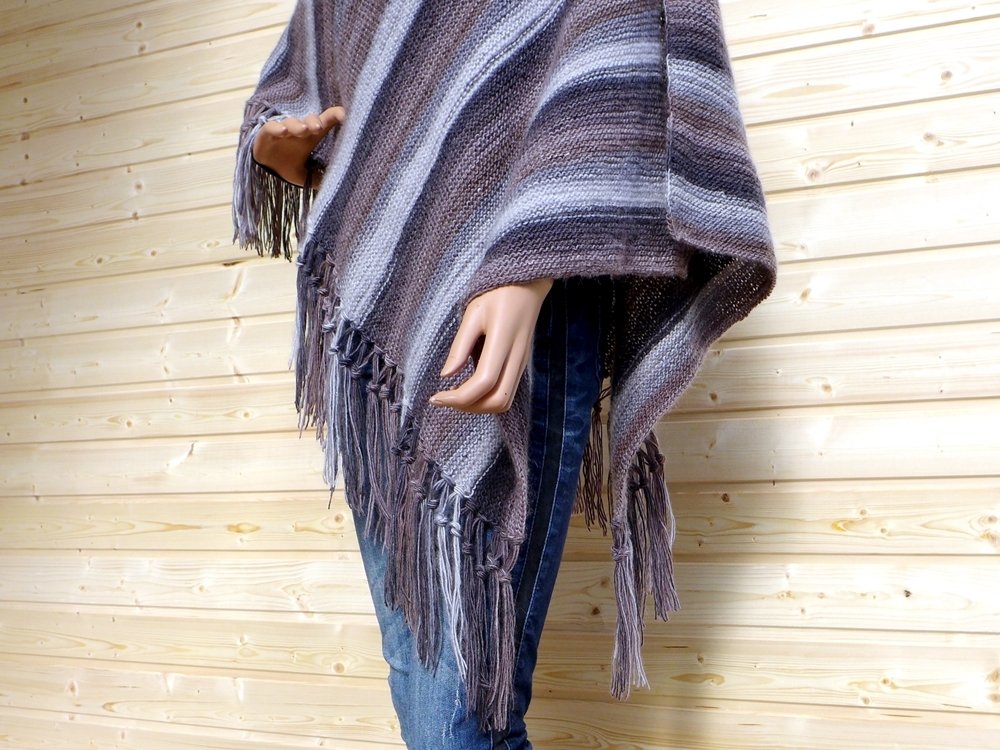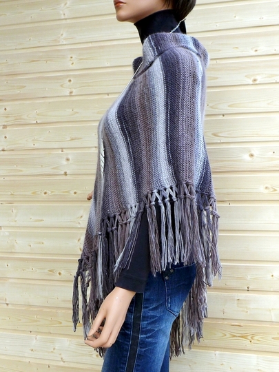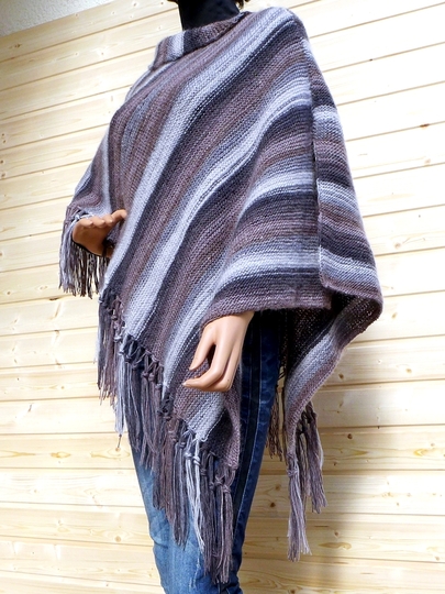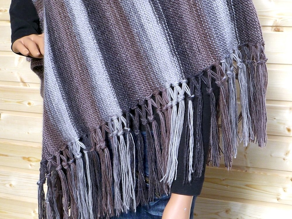 The poncho has a universal size of 80 x 66 cm (approx. 31.5 x 26 inches) with fringes. It's made with 500g (1.10lb) 6-thread sock yarn with a stocking stitch. The 14-page illustrated guide takes you step-by-step through this project in US ENG.