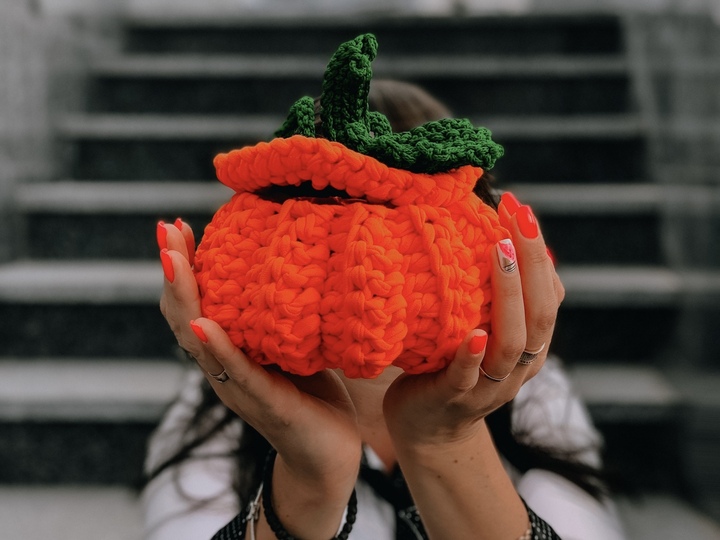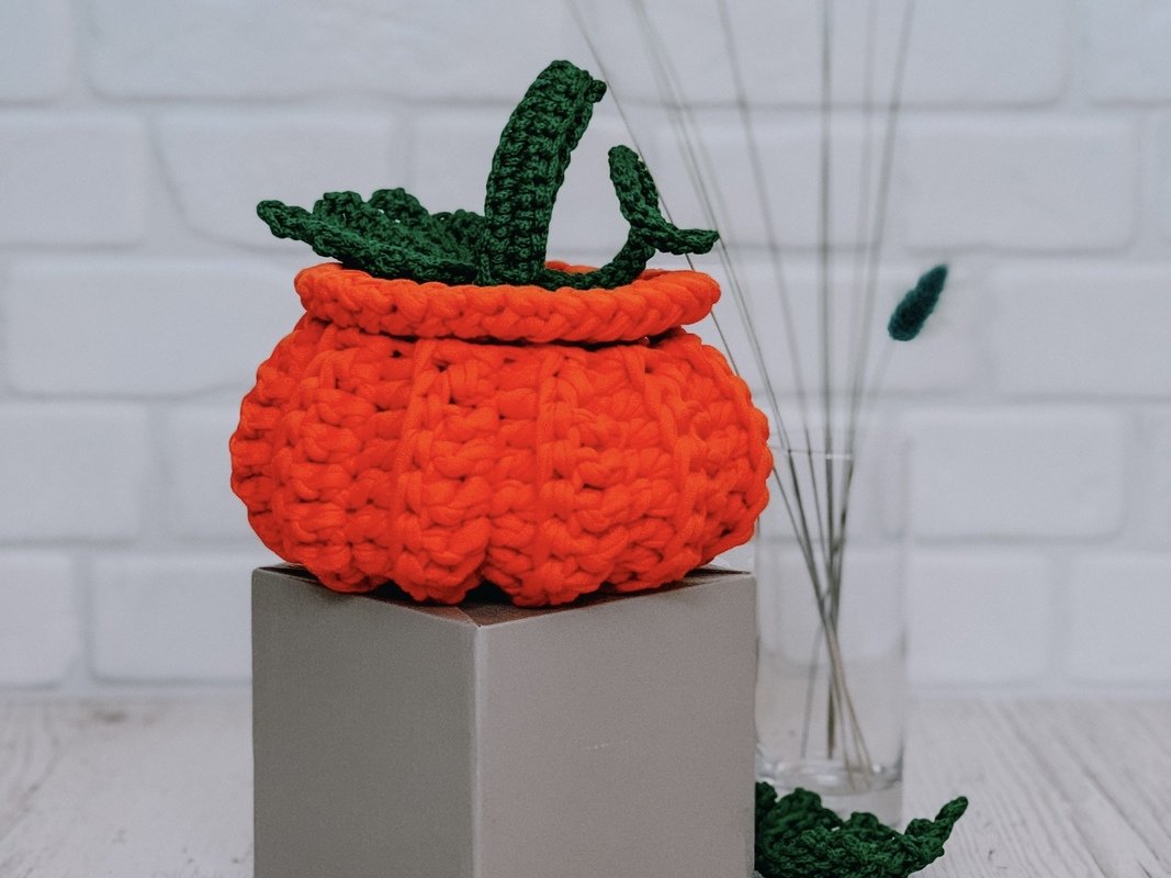 This crochet pattern contains instruction with step-by-step on how crochet basket pumpkin with t-shirt yarn.