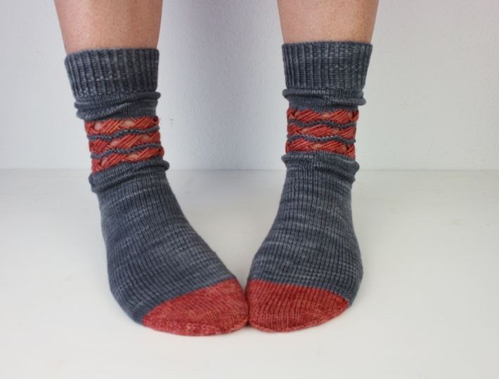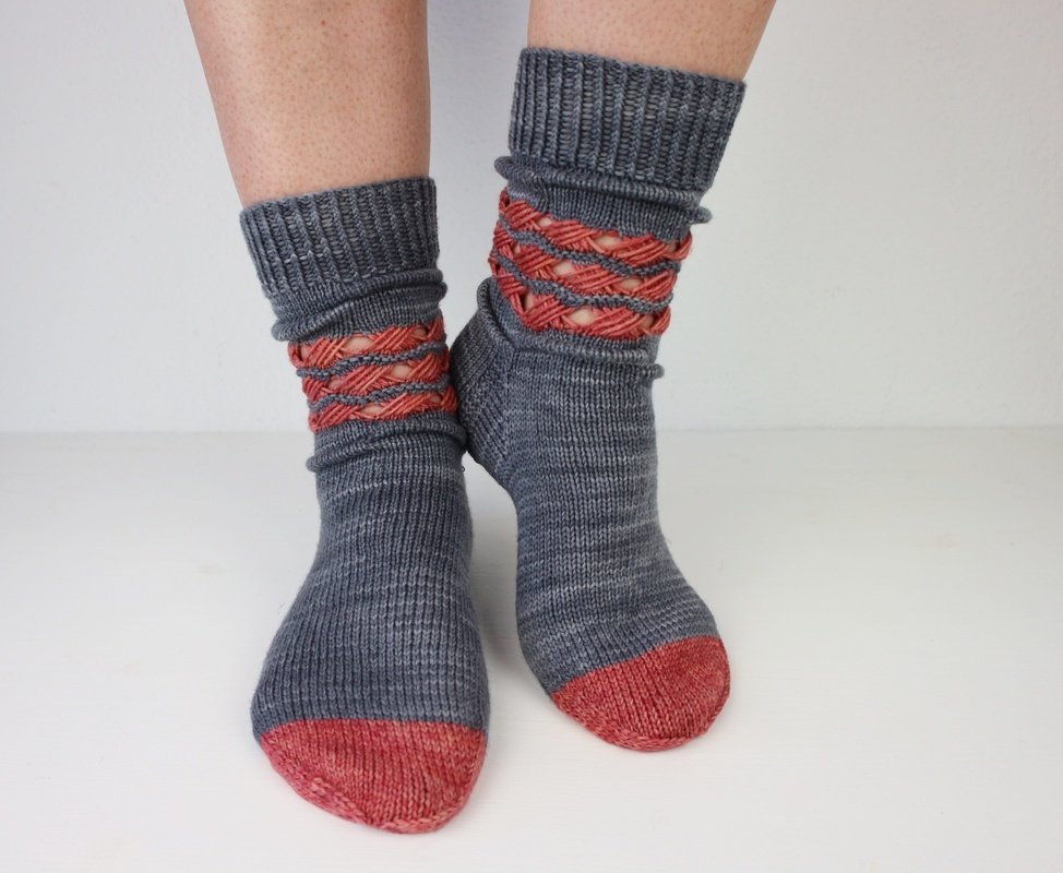 These socks are knitted from the cuff down. The heel is a cap heel and the end is the band lace.