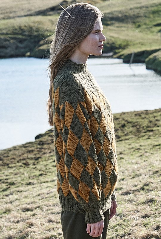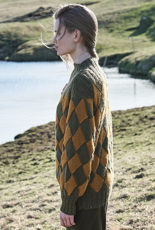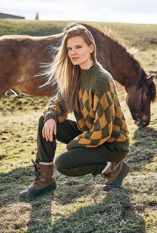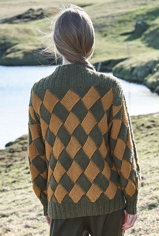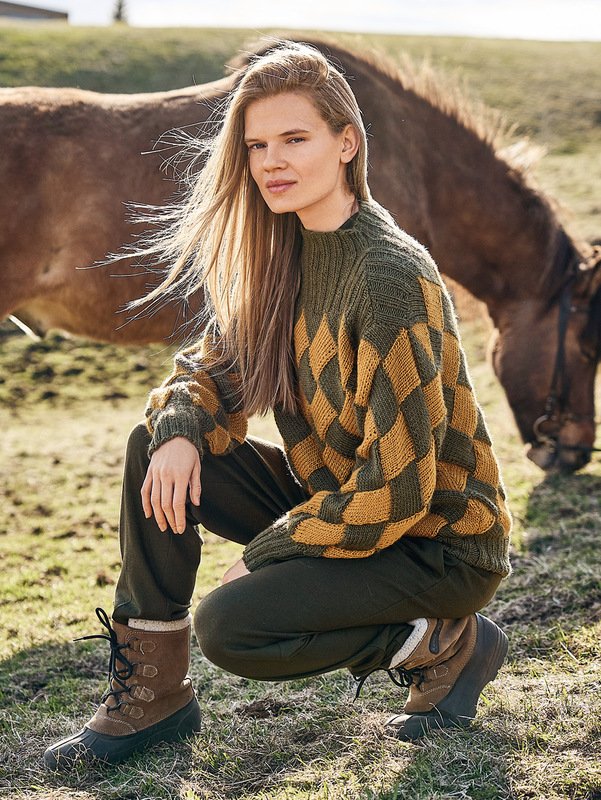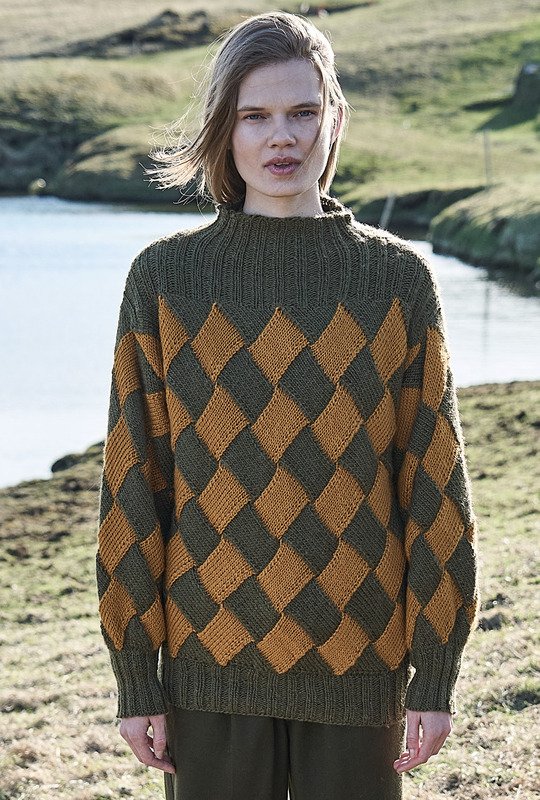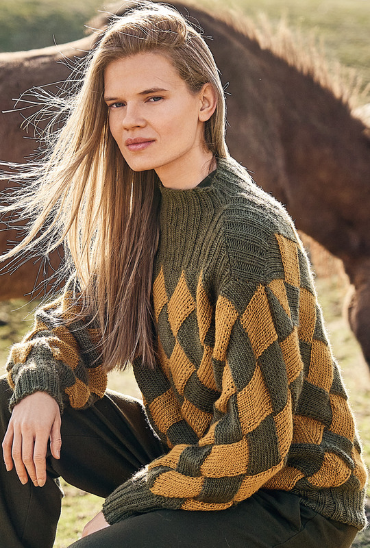 Zugegeben, bei diesem Sweater braucht es Geduld und etwas Strickerfahrung, denn die Entrelac-Technik ist ein anspruchsvolles Verfahren, das sich aus einzelnen Segmenten zusammensetzt: Dreiecke für den unteren und oberen Rand, Rechtecke für den Rest. Dafür entsteht die Schulterpasse in einem schlichten Rippenmuster, das auch bei den angestrickten Bündchen zum Einsatz kommt. Ein insgesamt beeindruckender Pulli, der Dich aus strapazierfähigem Schurwoll-Synthetikgarn bis weit in den Winter hinein begleiten wird.