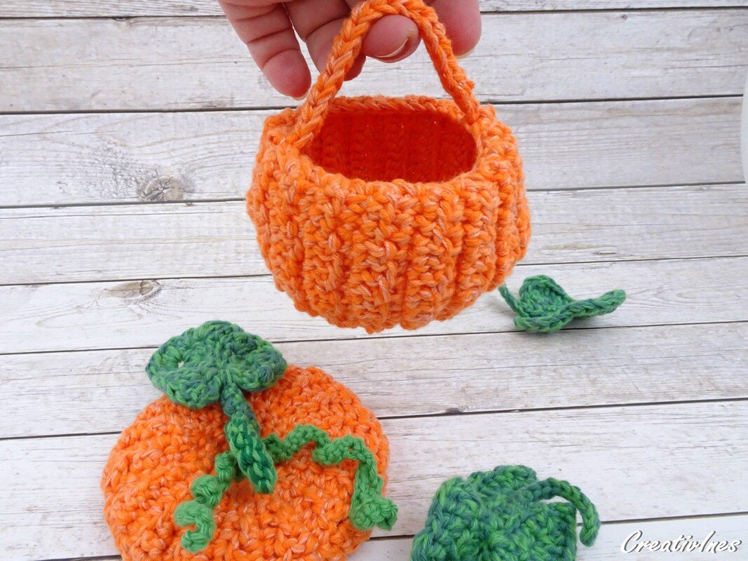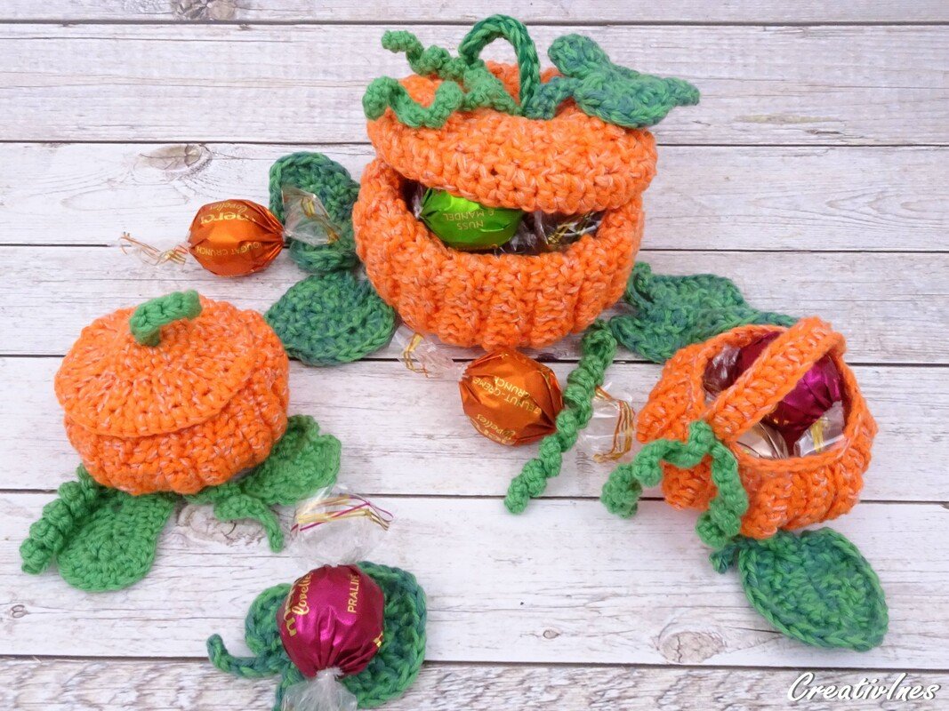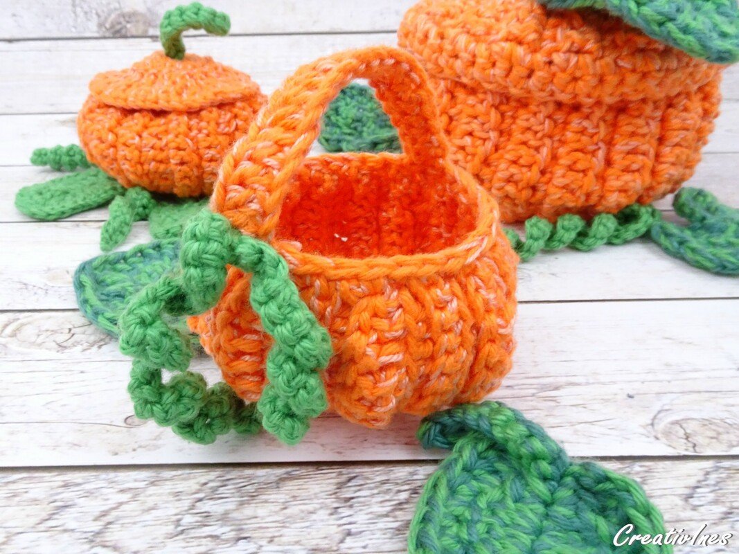 Ausführliche Anleitung zum Häkeln von kleinen Körbchen in Kürbisform, mit Deckel oder Henkel, als Wende-Körbchen, mit Ranken und Blättern. Viele Variationsmöglichkeiten sind erklärt.