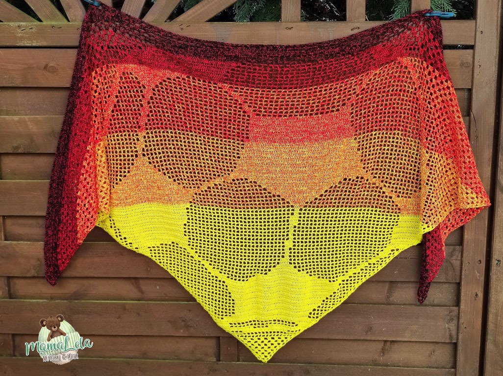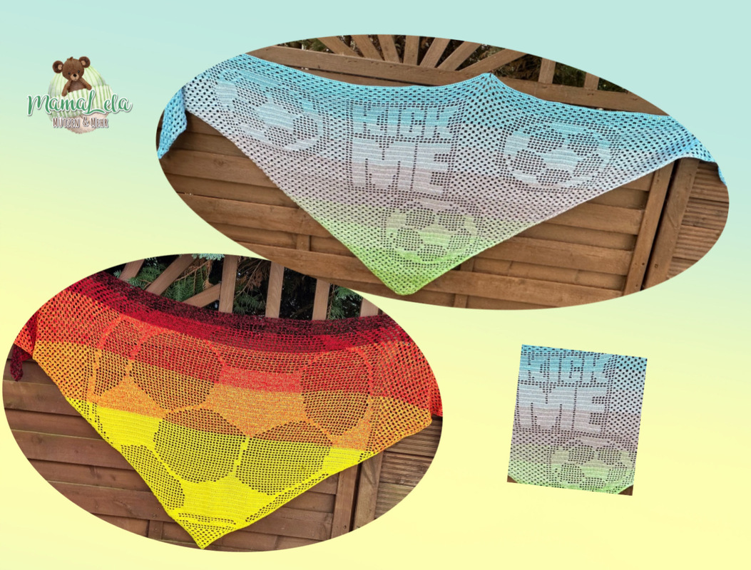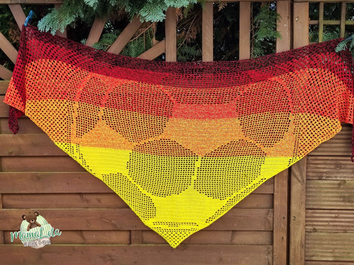2022 – Die Fußball-WM im Winter, da meinte mein großer Sohn, dass Mama doch ein Deutschlandtuch mit Ballmotiv häkeln könnte. Gesagt getan! Natürlich könnt ihr euer Tuch in den Farben eurer Lieblingsmannschaft häkeln – die Möglichkeiten sind nahezu unbegrenzt. Auch ließe sich das Motiv für einen Mann mit etwas Geschick leicht in einen Schal integrieren. (Hierfür nicht spitz beginnen, sondern mit einer LMK für die Gesamtbreite.)