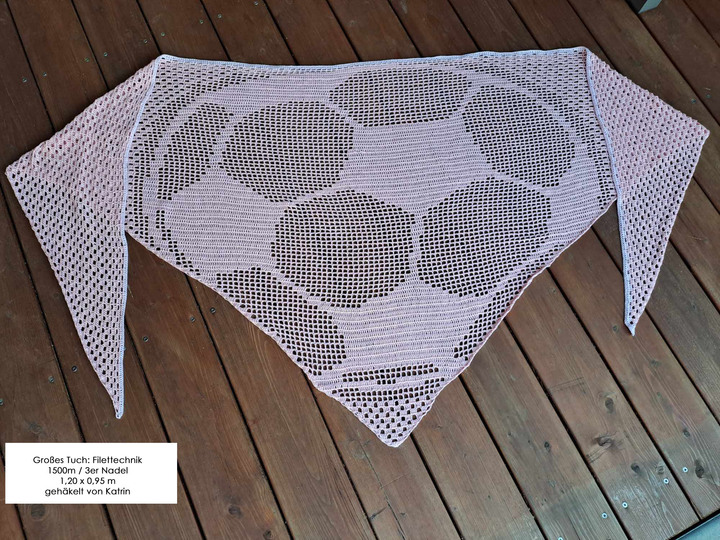 In der Filettechnik mit einer 3er Nadel und 1500m/3fädig misst das Tuch 2,90x0,95 m
