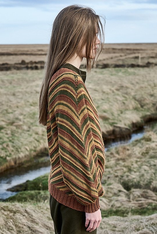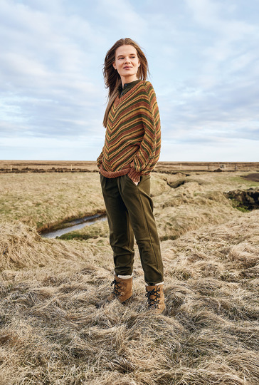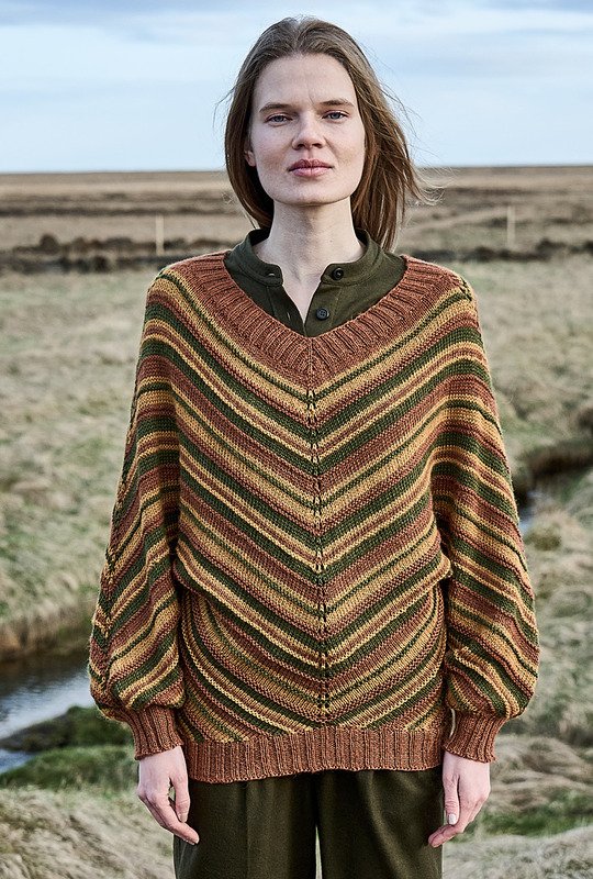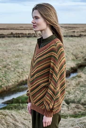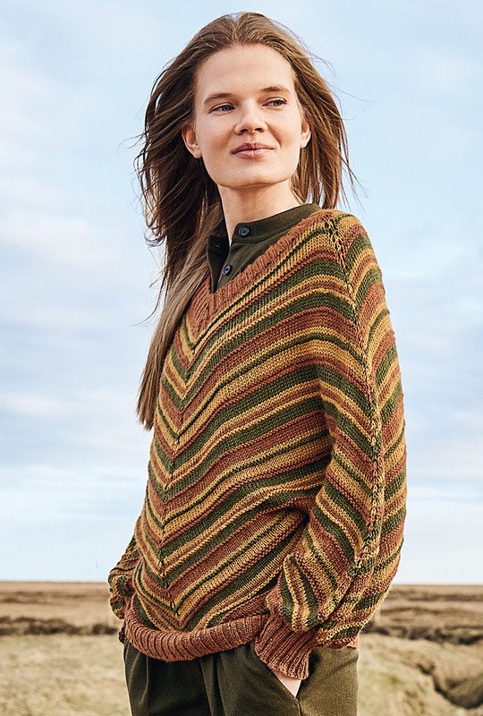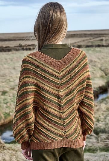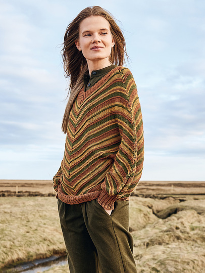 Ganz schön schräg: Braun, Senf und Grün vereinen sich hier zu einem schlichten, aber wirkungsvollen Streifenmuster aus rechten und linken Maschen. Der diagonale Farbverlauf ist raffiniert: Er entsteht durch Zunahmen in der Mitte und Abnahmen an den Seitenkanten. Das hört sich komplizierter an als es ist, einfach ausprobieren. Und das Beste: Der Fledermauspulli wird nahtlos an einem Stück in Runden gestrickt. Zum Schluss müssen nur noch die Rippenbündchen angestrickt werden.