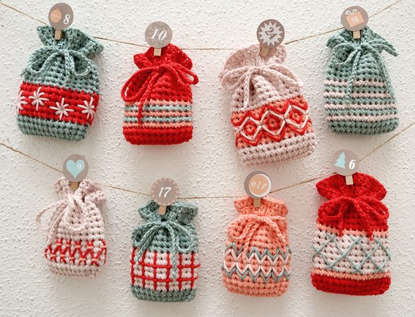 Beautiful Advent calendar in hygge style: Thanks to the simple pattern and the slightly thicker yarn, the individual bags are crocheted briskly. With the special "Doppelmasche" it is possible to crochet in rounds without offset and it creates an optimal background for embroidery motifs - so you can design each bag individually - here are your imagination no limits.