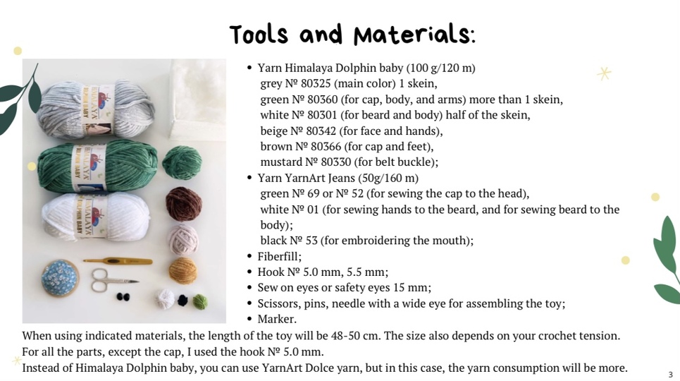 green No 80360 (for cap, body, and arms) more than 1 skein, white No 80301 (for beard and body) half of the skein,