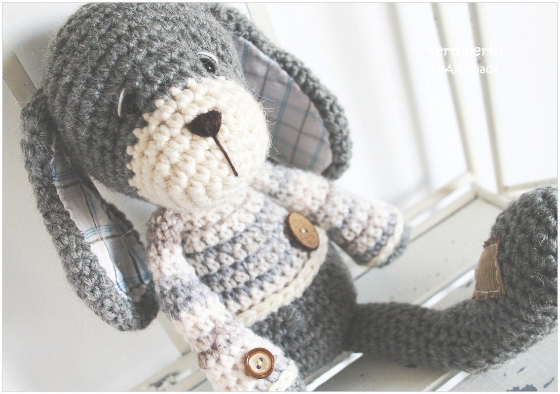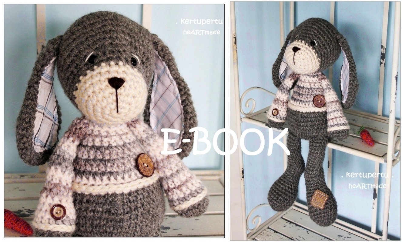 Dieses Häschen trägt einen schönen Pullover mit naturfarbigen Streifen und Knöpfchen. Stoff bei den Schlappohren sieht ja auch ganz toll aus! Du kannst die niedliche Detailien genau so gestalten wie Du sie haben möchtest (Anleitungen sind dabei). Auch den Pullover kannst Du in den Lieblingsfarben häkeln, es gibt viele Möglichkeiten :)