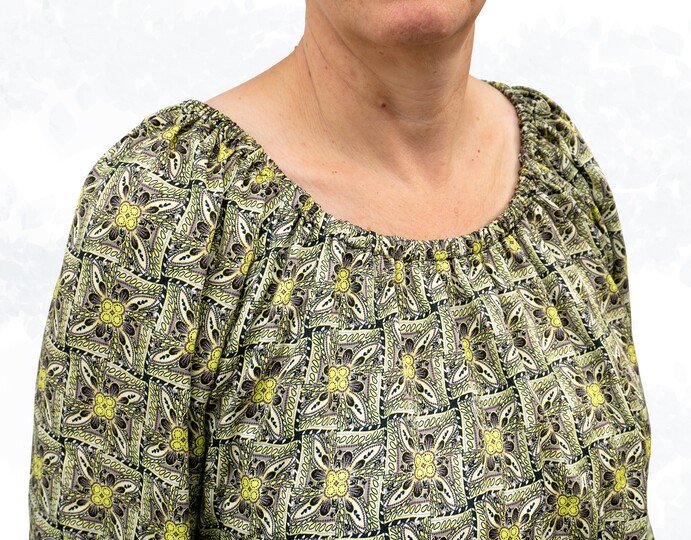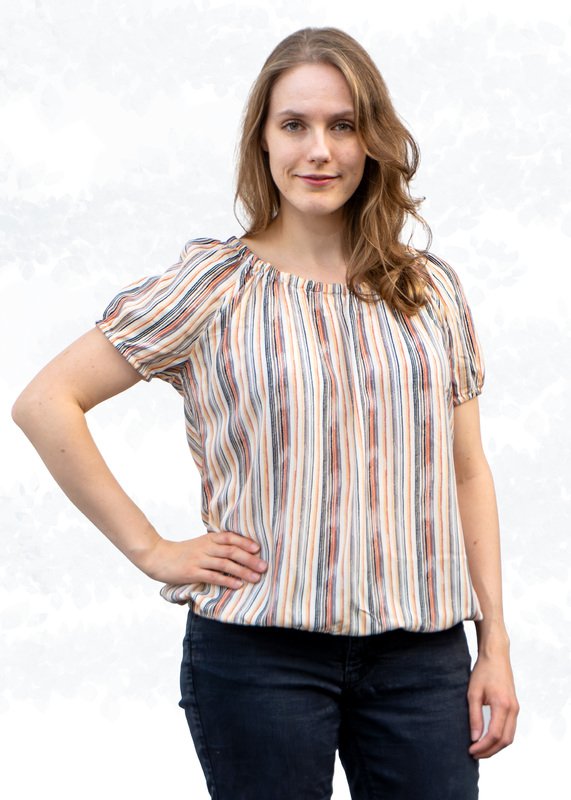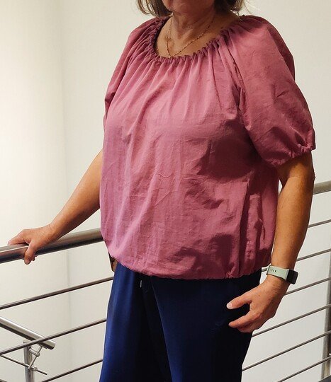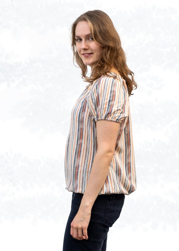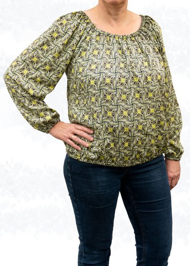 The “Ida” pattern is a loose-fitting off-shoulder blouse with a gathered neckline. Thanks to the elastic band in the neckline, the blouse can also be worn off the shoulders.