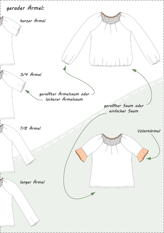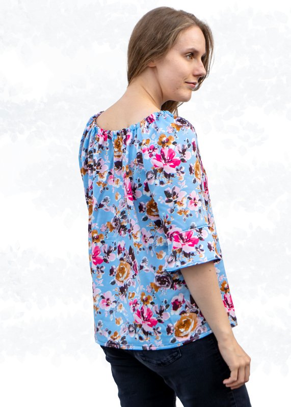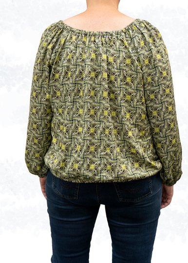 The blouse is hip-length and can be worn loosely or tucked into pants. The straight sleeves are wide and available in four lengths in the pattern. Alternatively, you can sew the sleeves with a ruffle hem.