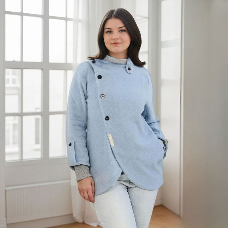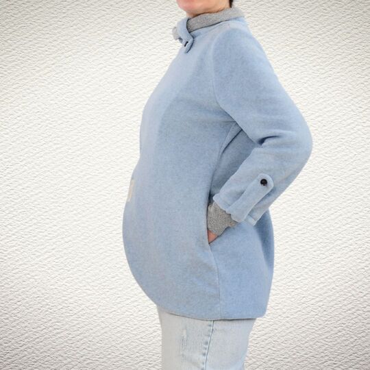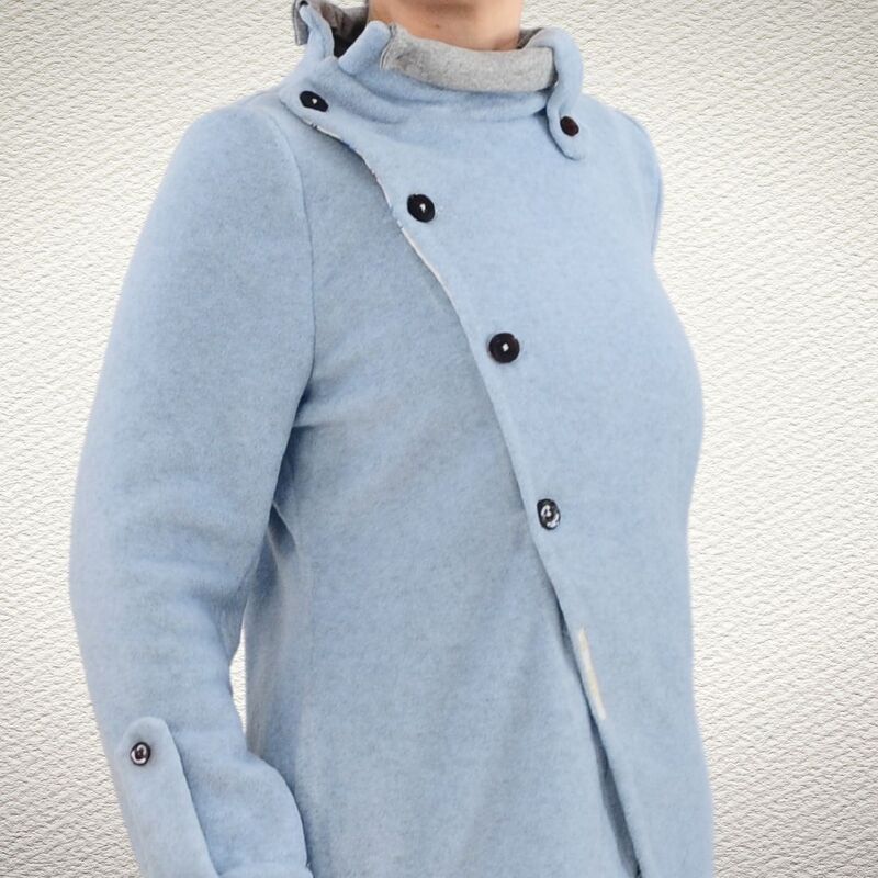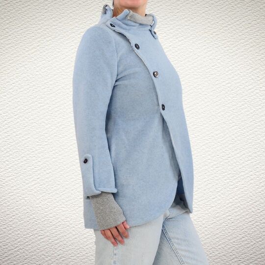 With the Eliane pattern you can make an extravagant transitional jacket with a stand-up collar and cool fake bars on the collar and sleeves.