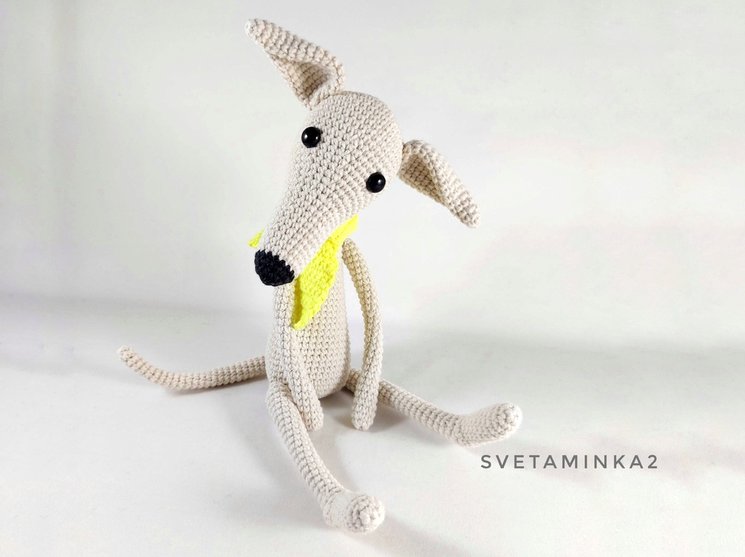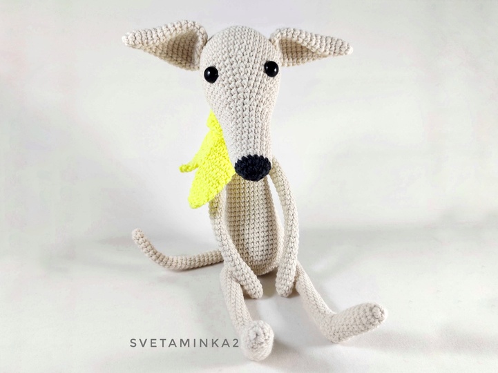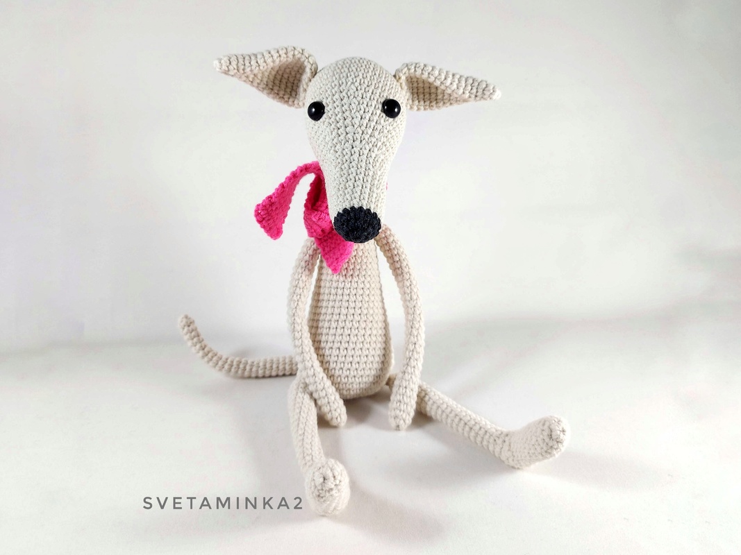 Whippet Crochet Pattern to make amigurumi crochet dog (Greyhound, Italian Greyhound, Whippet, Galgo, Lurcher, Sighthound) (downloadable pdf file) in English (US terms), very detailed, very clear instructions and tips with lots of photos for each step. (the original pattern by svetaminka2)