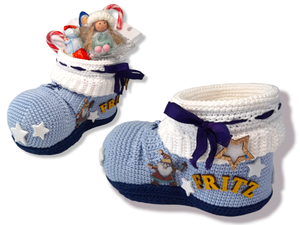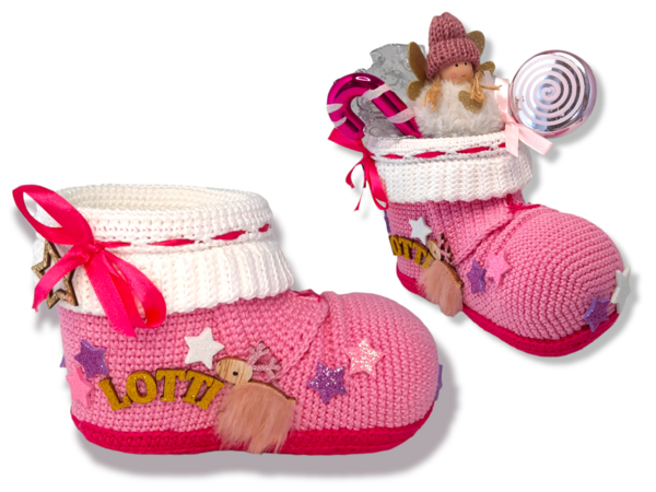 The pattern for the Santa boot consists of 17 pages and is also provided with many colored detailed pictures. The pattern also explain how to adapt the shoe to different cup sizes.