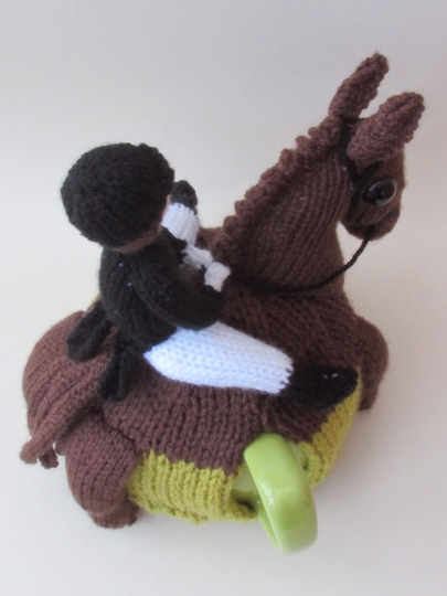 This product is the knitting pattern only; to knit your own dressage horse and rider tea cosy.