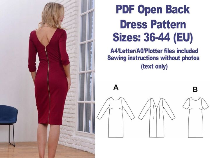 Dress with V-neck back, bust darts, two varieties of sleeve length (long and short), two varieties of zippers on the back (open end zipper or invisible zipper on choice). Sewing of both variants zippers is presented in instruction.