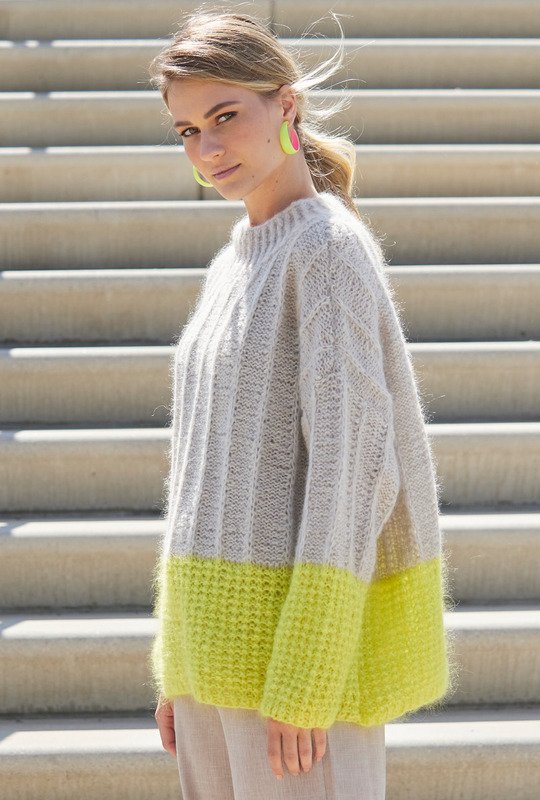 Zurückhaltendes helles Beige und leuchtendes Zitrusgelb vereint in einem legeren Oversize-Pulli aus Mohair-Schurwolle-Garn, der durchaus auch zu einem eleganten Outfit passt. Die breite Bordüre an Vorder-, Rückenteil und Ärmeln wird in einem einfachen Strukturmuster gearbeitet, ansonsten kommt ein Muster aus glatt links mit einer Hebemasche dazwischen um Einsatz. Der Turtleneck-Kragen am runden Halsausschnitt wird wie auch die schmalen Bündchen im 1/1-Rippenmuster mit rechts verschränkten und linken Maschen gestrickt. Die Anleitung steht für die Größen 38/40, 42/44 und 46/48 zur Verfügung.