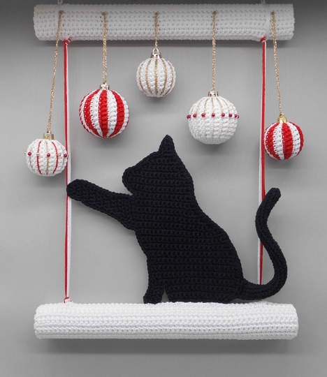 The cat crocheted as a silhouette and the three-dimensional Christmas baubles are an unusual eye-catcher for doors and walls and really make you want to celebrate Christmas.