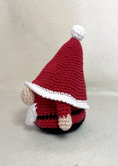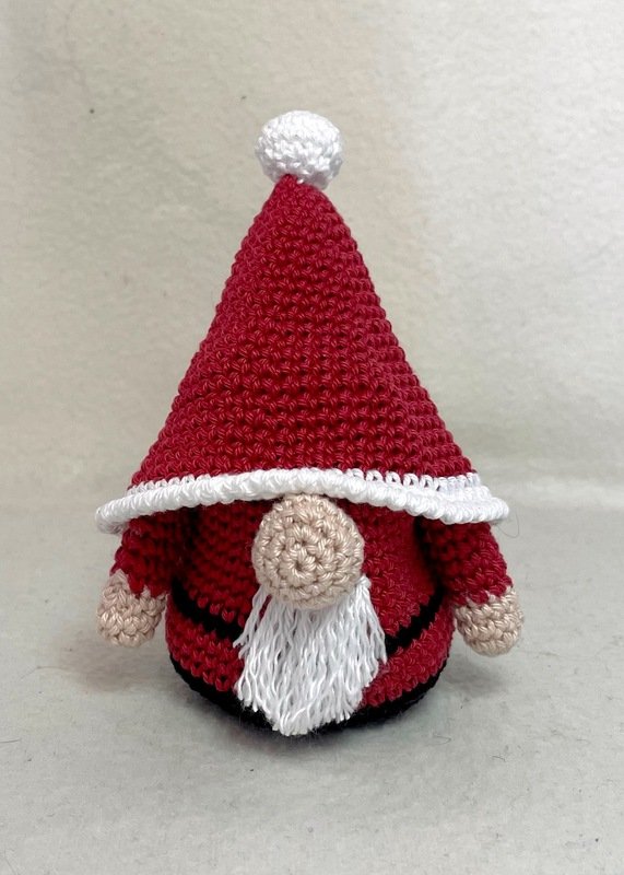 Mit der von mir verwendeten Wolle wird die Figur ca. 20 cm hoch, der Körper hat einen Durchmesser von ca. 5 cm. Bei der Verwendung eines Garns mit einer anderen Nadelstärke wird der Wichtel dementsprechend größer bzw. kleiner.