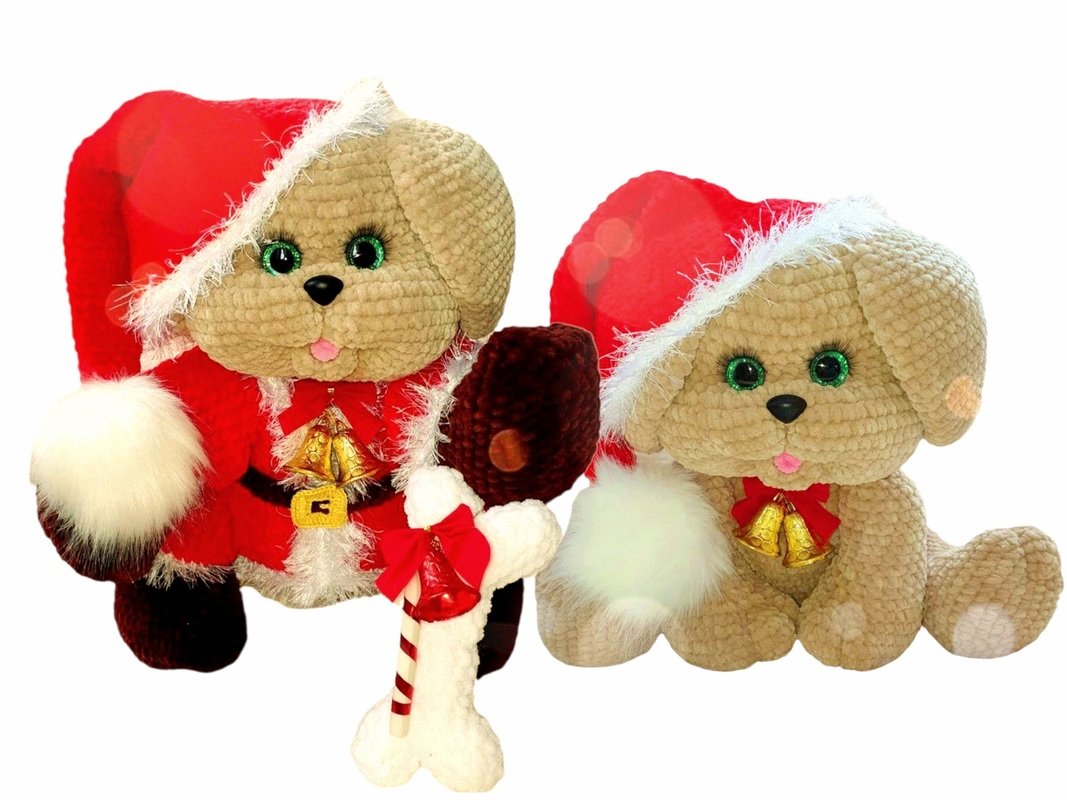 The little puppies look really cute in their Christmas outfit. The outfit consists of the jumpsuit, the shoes, the belt and a Santa hat. If you use other colors for the overall and for the hat, you have a sleeping outfit. The instructions for the puppies and the bone are not included.