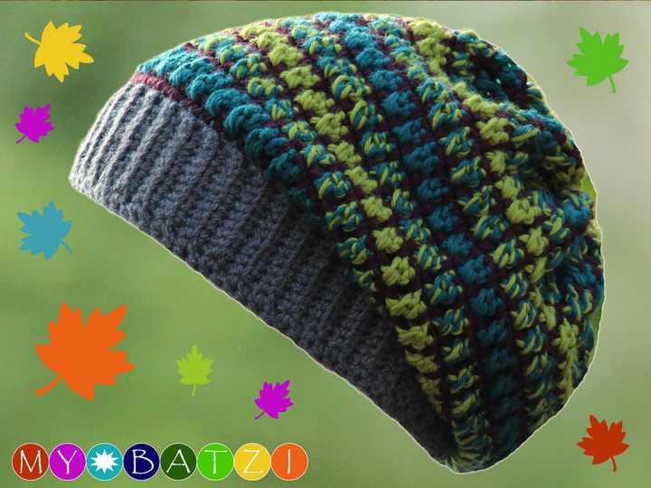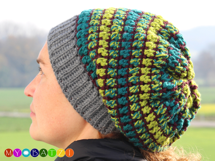 Die Beanie kann an jede Kopfgröße angepasst werden udn kann somit für Kiinder und Erwachsene gehäkelt werden.