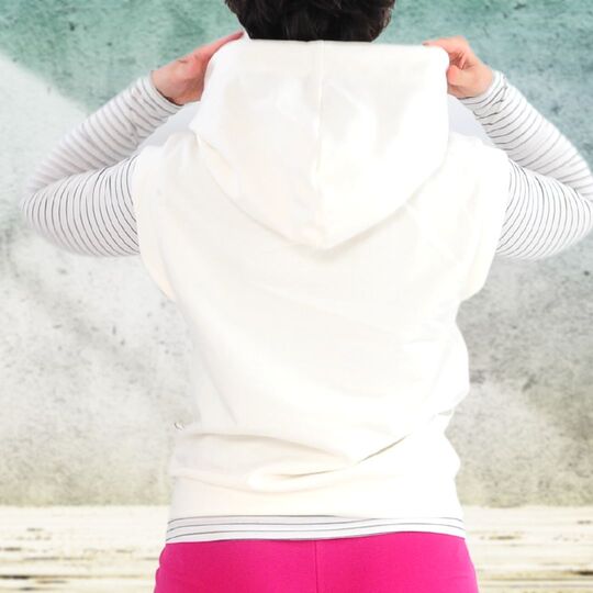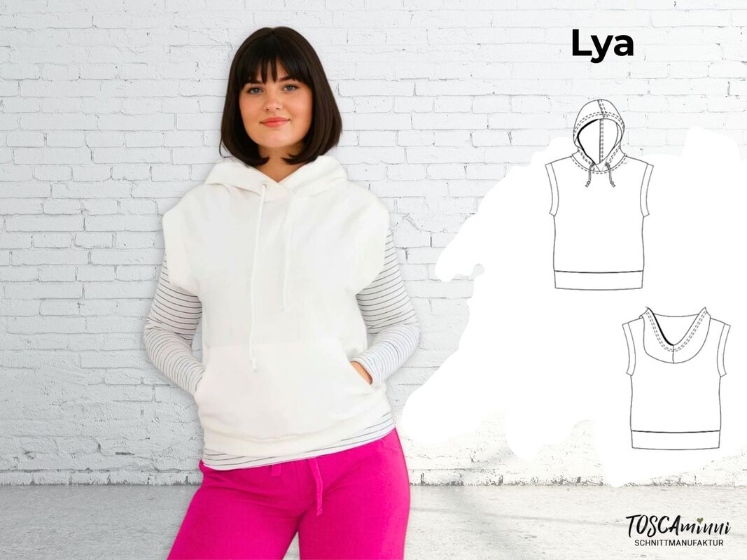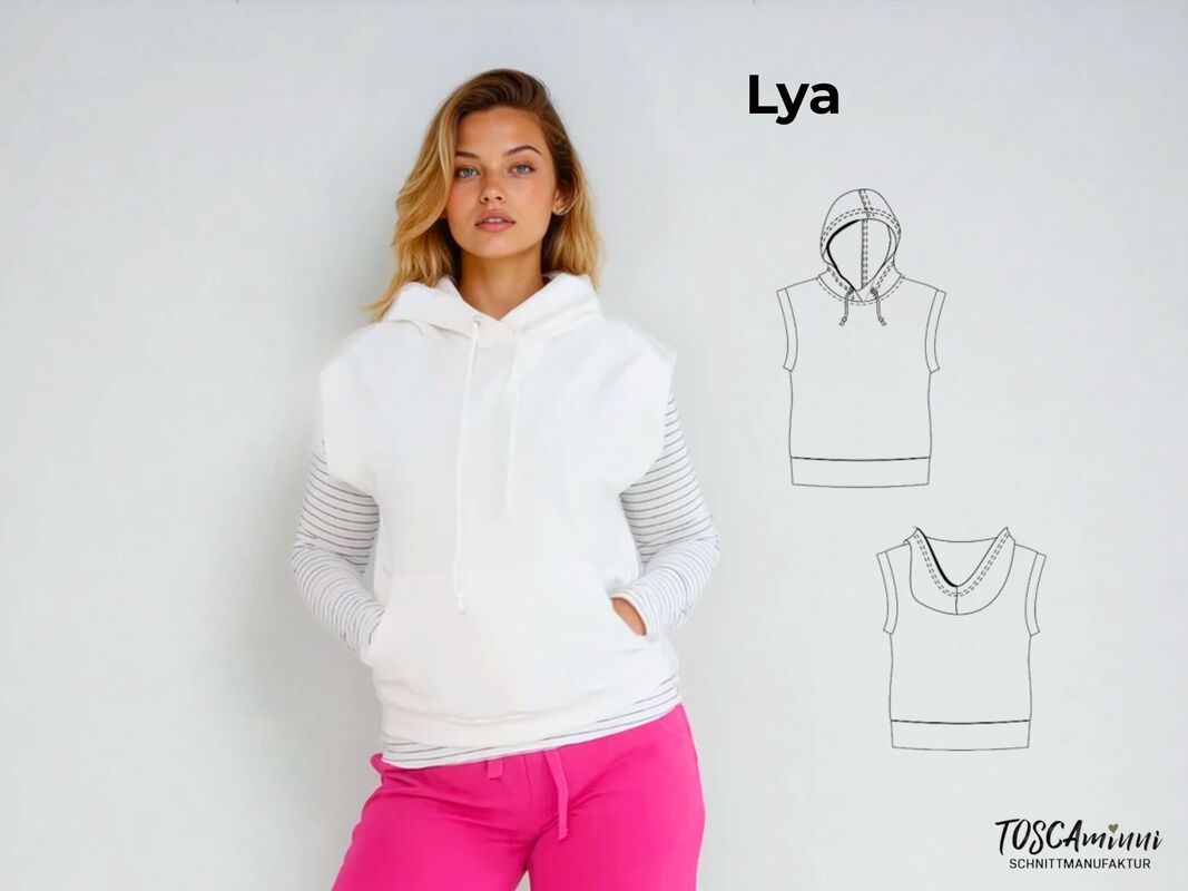 With the Lya pattern, you can make a cool pullover with a hood that is perfect for cooler days in combination with a long shirt. The hood and the pouch pocket give the slipover a cool touch.