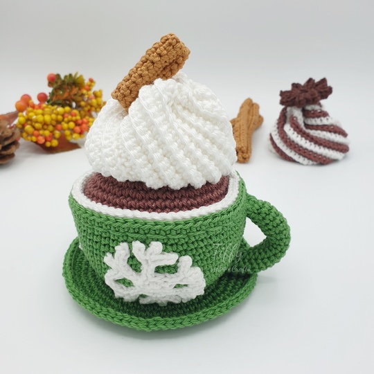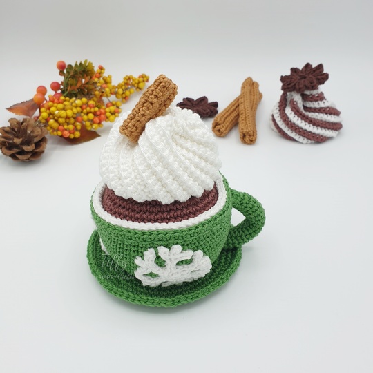 In the pattern consists of: 1)Mug 2)Saucer 3) Hot Cacoa 4) Whipped Cream 5) Star Anise 6) Cinnamon (short & long) 7) Snowflake