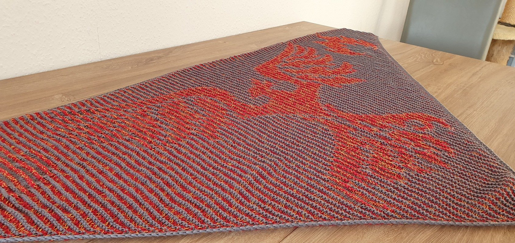 The finished shawl measures approximately 175 cm (width) x 78 cm (depth) in my version.