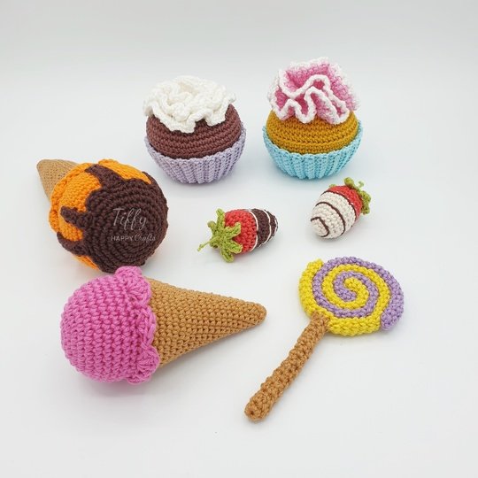 Easy to follow crochet SWEET SET pattern will help you to make a beautifil amigurumi food play sweet set for your kids pretend play, as decor for your kitchen or for your friends.
