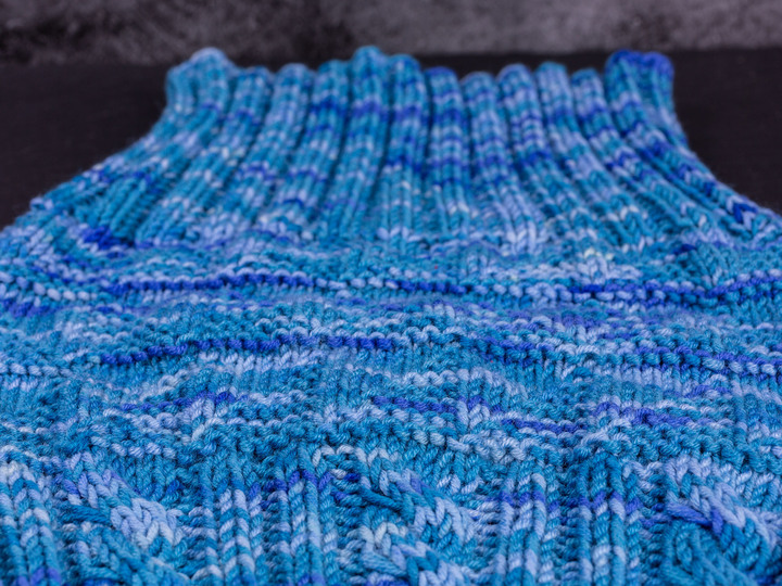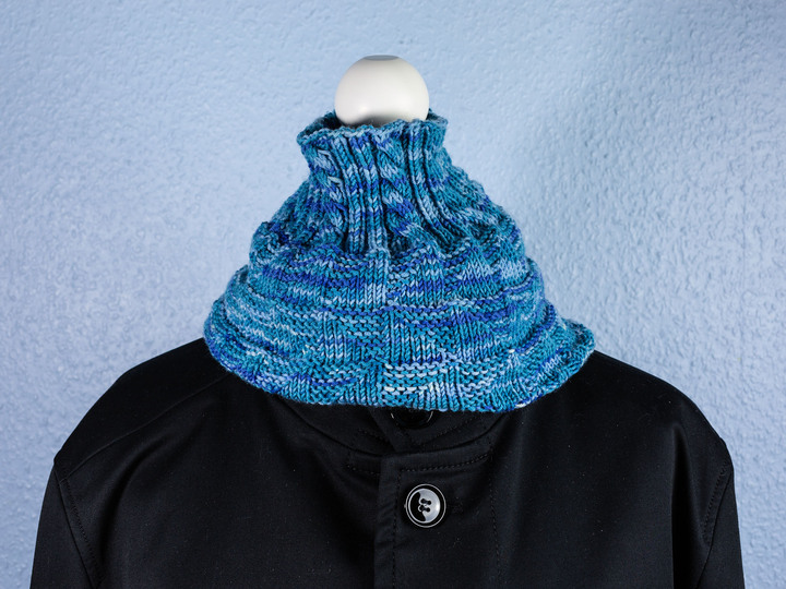 There are two different versions of the collar – one slightly narrower with cable pattern, the other extra-warm with a turtleneck.