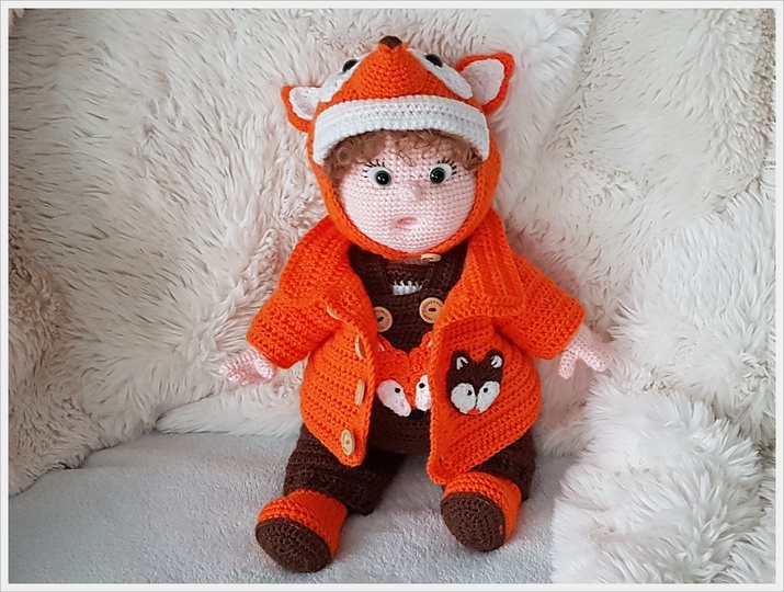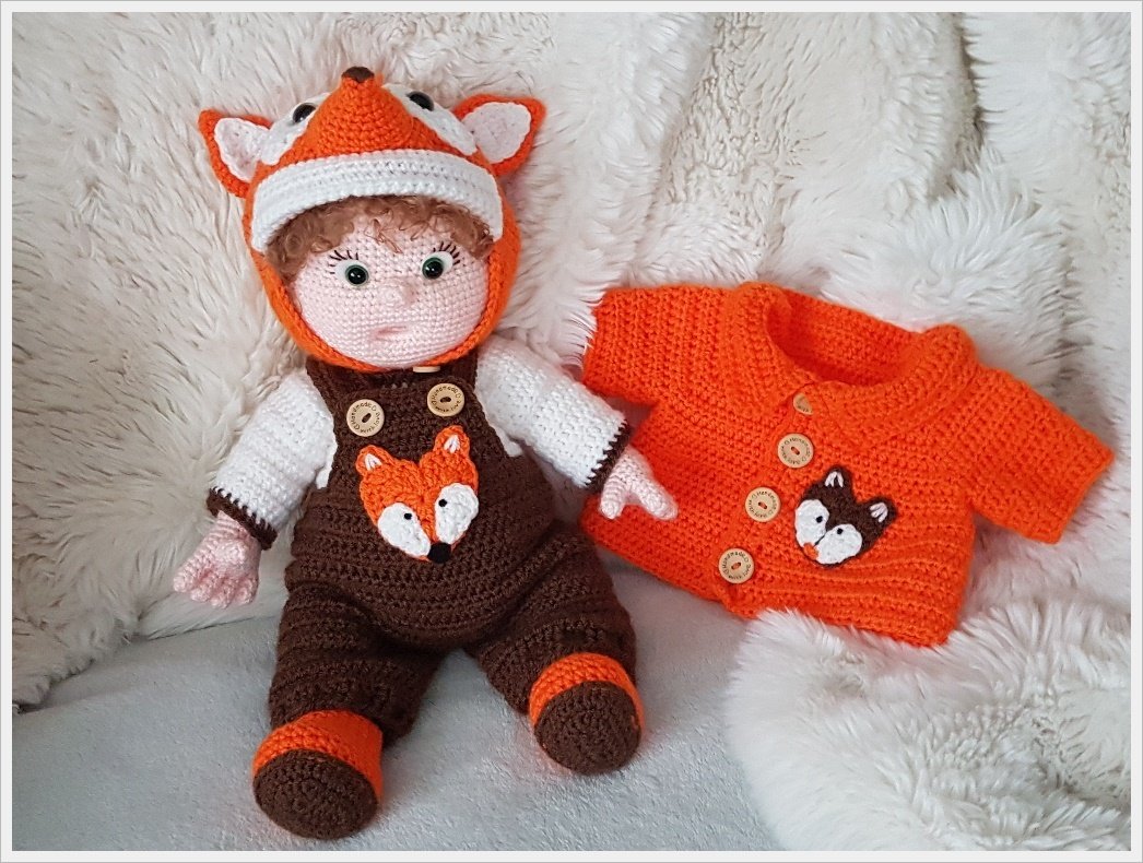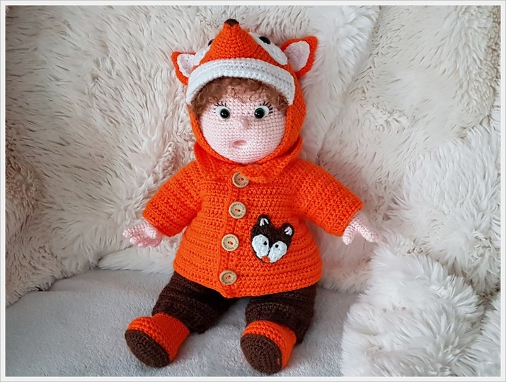 Darf ich vorstellen, das ist Loui. Ein kleiner lockenköpfiger Babyjunge. Er hat eine Fuchslatzhose, eine Mütze, einen Pullover, kleine Stiefelchen und eine Fuchsjacke an. Du kannst ihn auch komplett nackig machen und die Sachen an- und ausziehen.