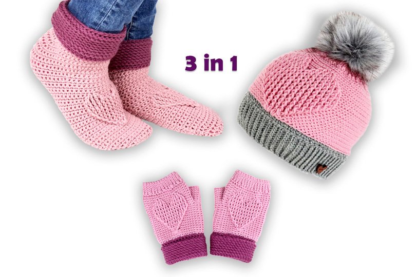Three PDF crochet tutorials consisting of illustrated tutorials for crocheting a hat "With the heart", all sizes, mittens "With the heart" (for adults and children from 6 yrs) and house socks "With the heart" (size 34-43). These are three crochet patterns, not the finished products! These crochet patterns include a detailed description and several photos (over 20-75 photos each).
