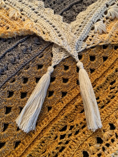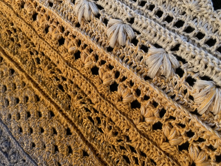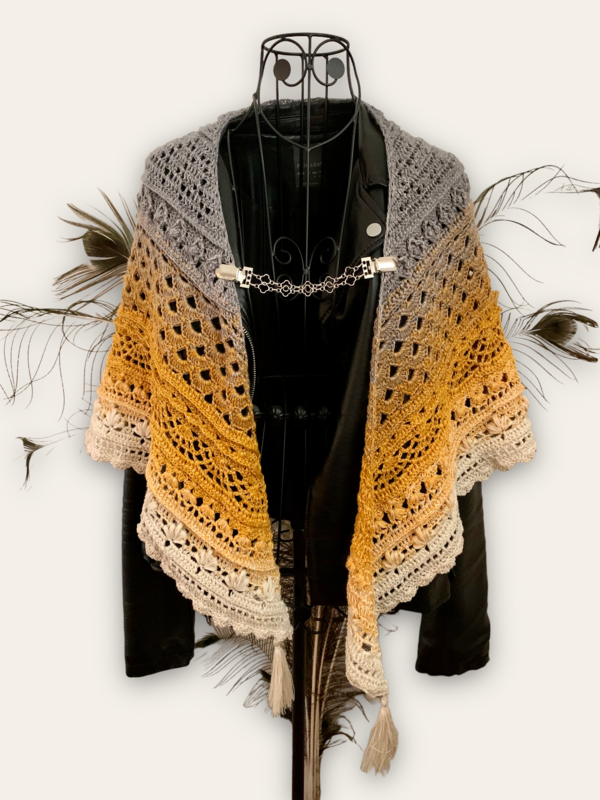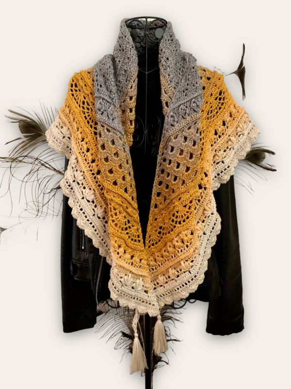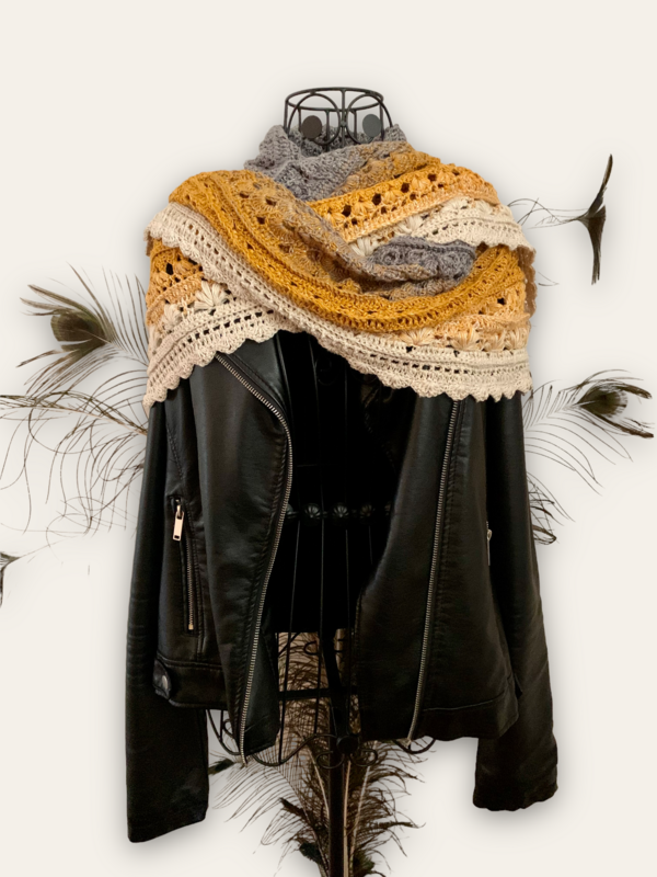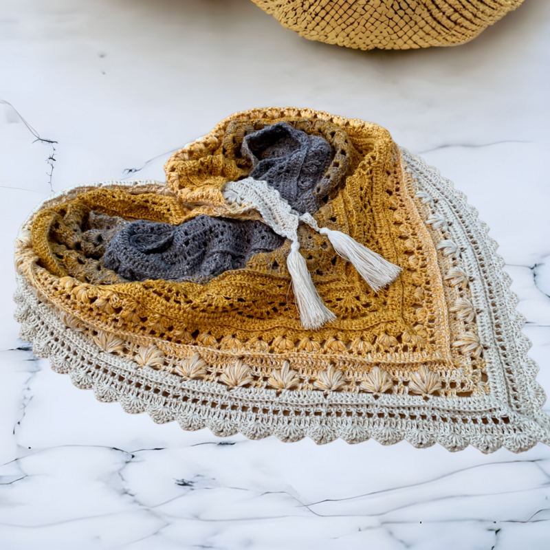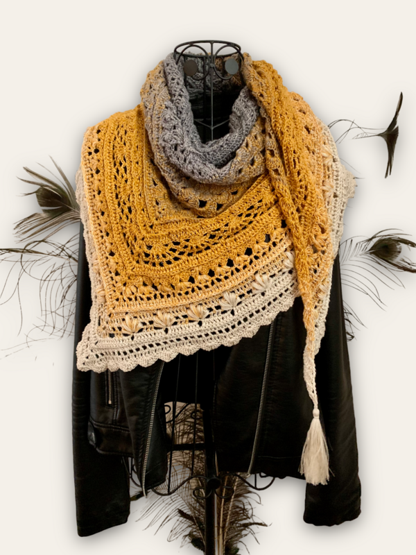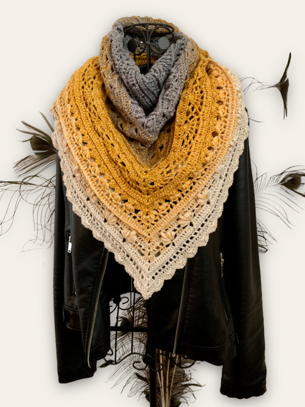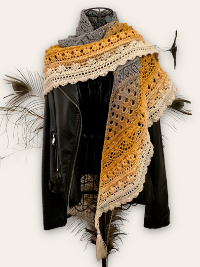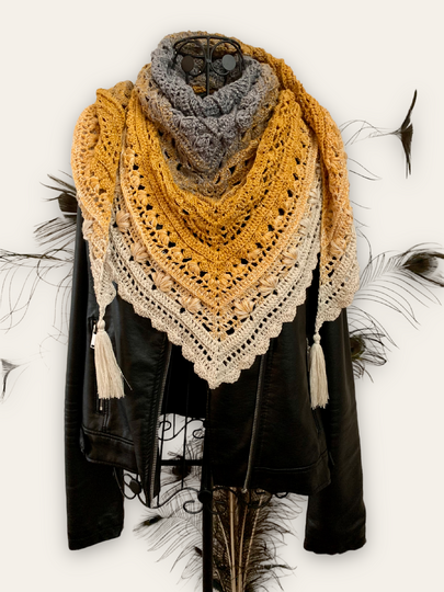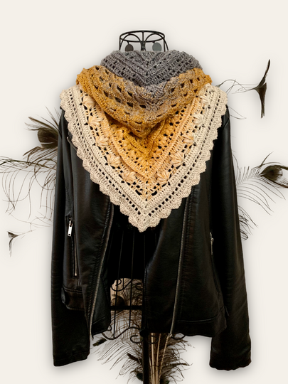 With this pattern you can crochet the beautiful triangular scarf "Balta". It contains my favourite patterns from different scarfs that I have published in 2022 and is therefore somthing where you do not get bored while crocheting.