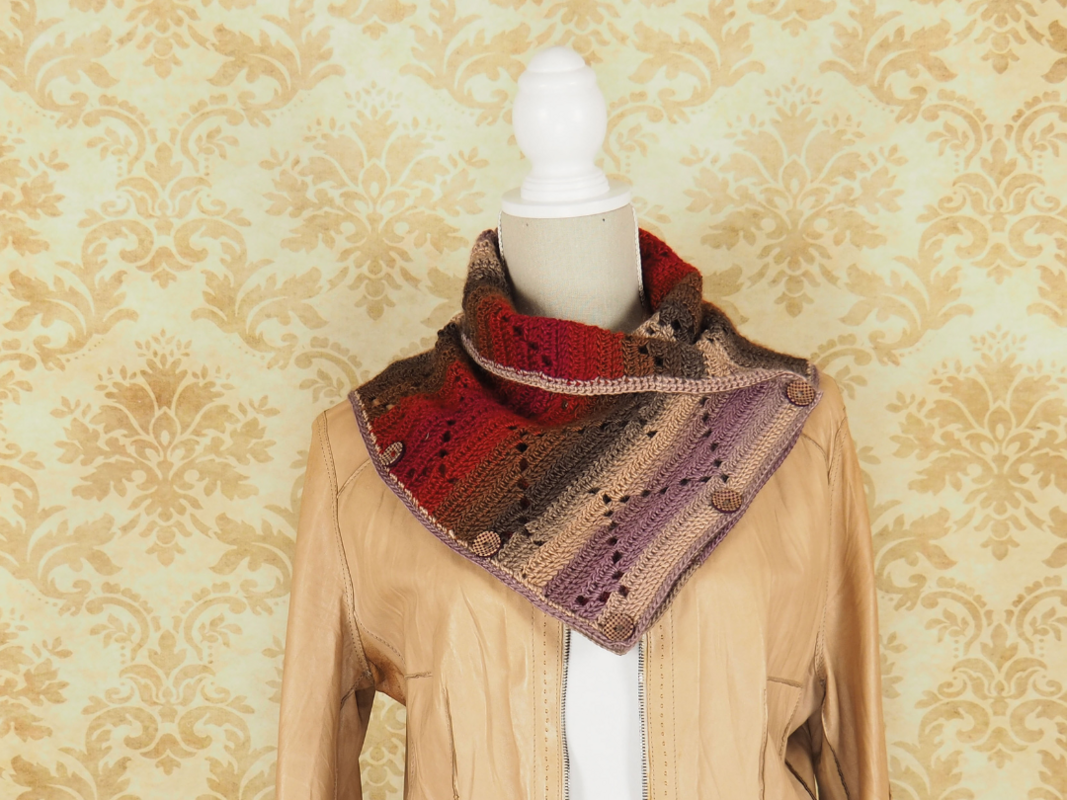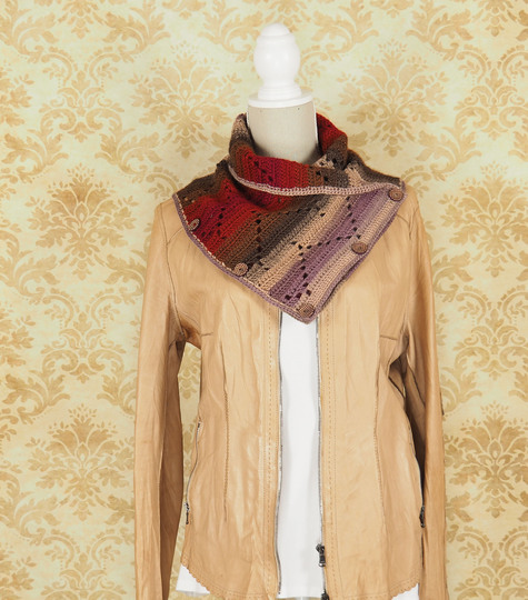 The neckwarmer was crocheted with Wanderlust by Scheepjeswol (see photo for details)