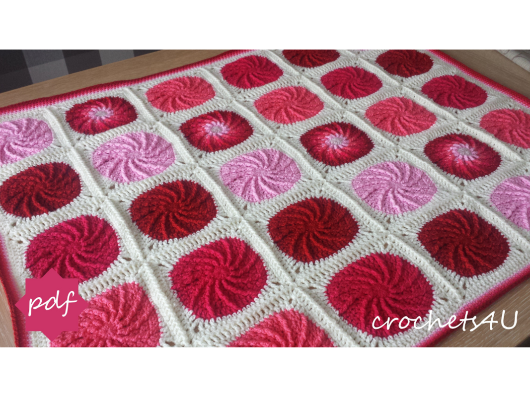 The blanket in the example is crocheted with acrylic yarn and hook size 4,5 mm and measures 96 cm x 78 cm.