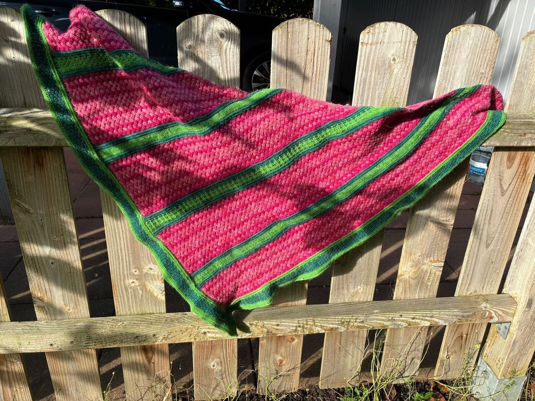 Depending on the wool and crochet style, between 141 x 68 cm and 210 x 105 cm