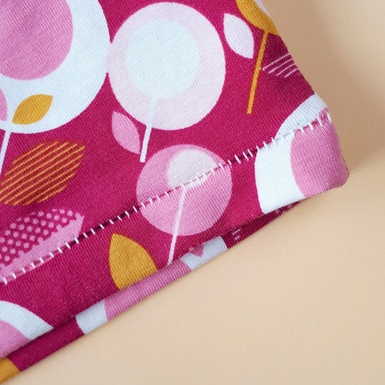 Es werden verschiedene Versäuberungsmethoden vorgestellt: Bündchenversäuberung, Einfassen mit Bündchen oder Falzgummi. Außerdem wird gezeigt, wie Du eigene Teilungen machst, um Jerseyreste zu verarbeiten, und es gibt ein Tutorial für einen 3-Faden-Flatlock-Saum für die Overlock-Maschine.