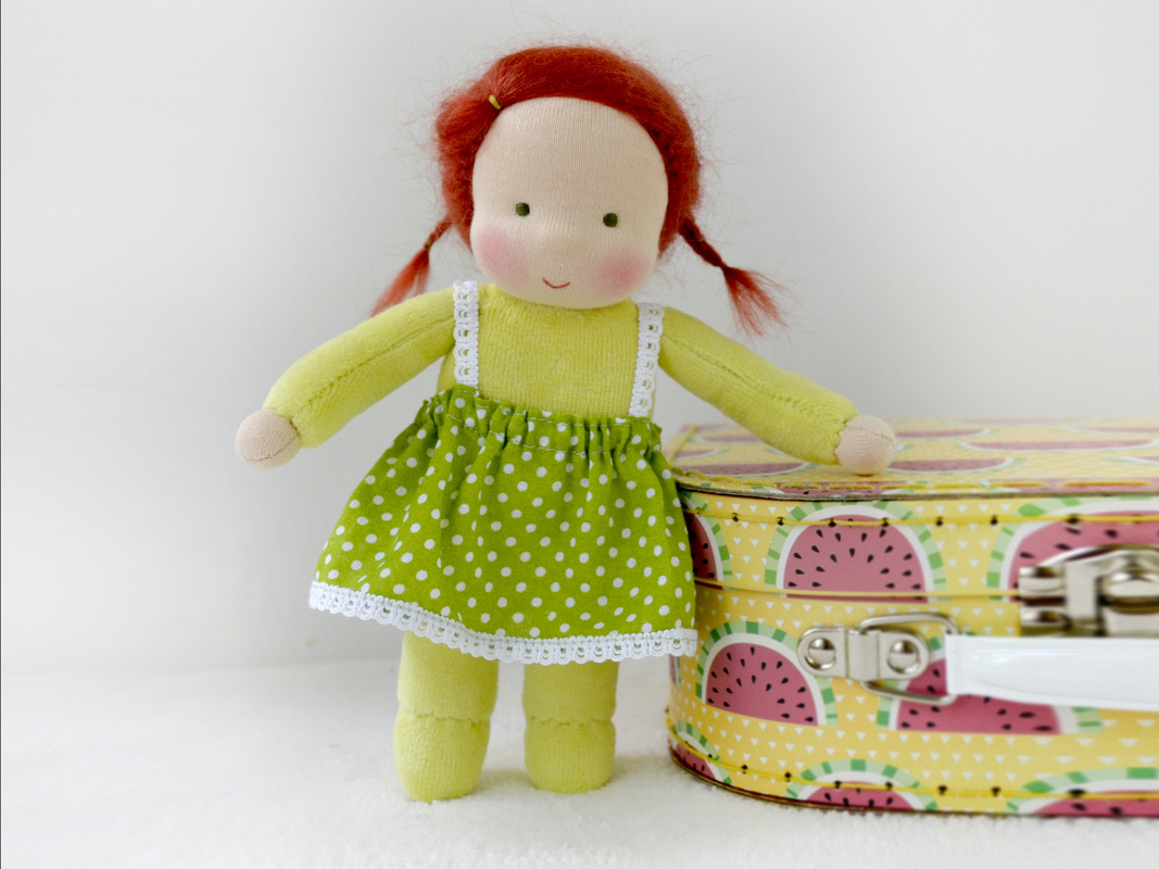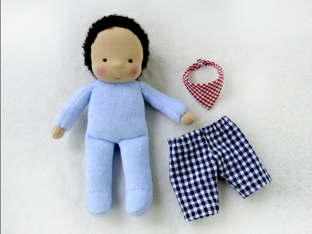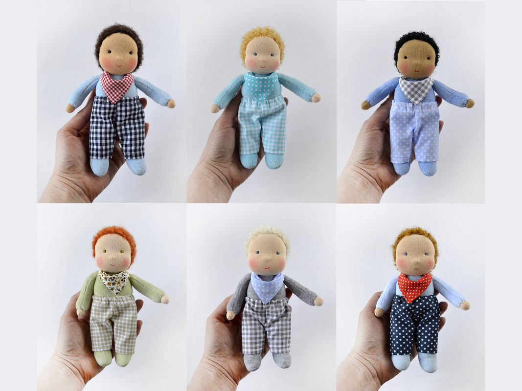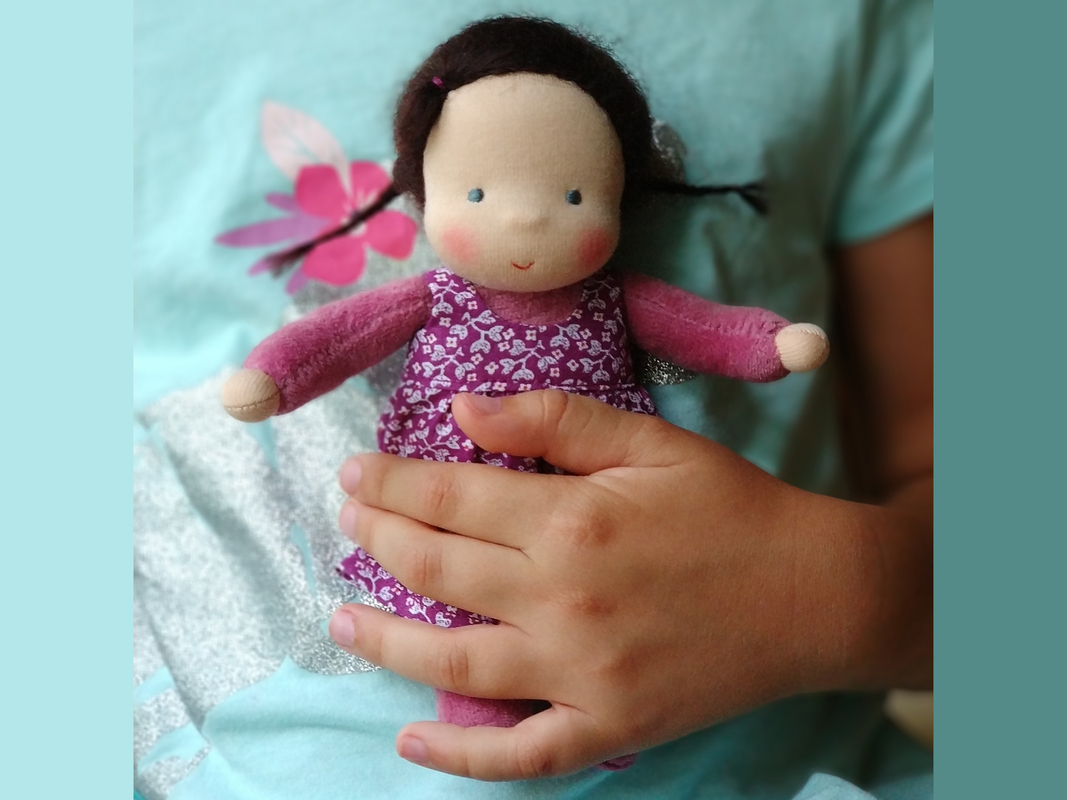 With this easy sewing pattern, you can create a 7 "(18 cm) Waldorf doll. This is the perfect size for little kids' hands. Such a doll is an ideal companion for a child: when traveling, in kindergarten or at school. The doll is made exclusively from natural materials: cotton jersey and velor, woolen yarn and natural sheep's wool. This pattern is suitable for beginners. You can sew the doll just by hand using basic hand stitches.