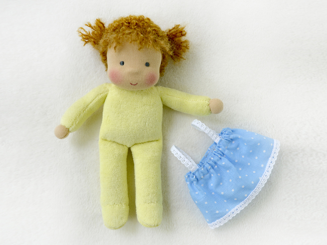 cotton velour for body, cotton doll jersey for head and hands, sheep wool for filling, mohair boucle yarn for hair