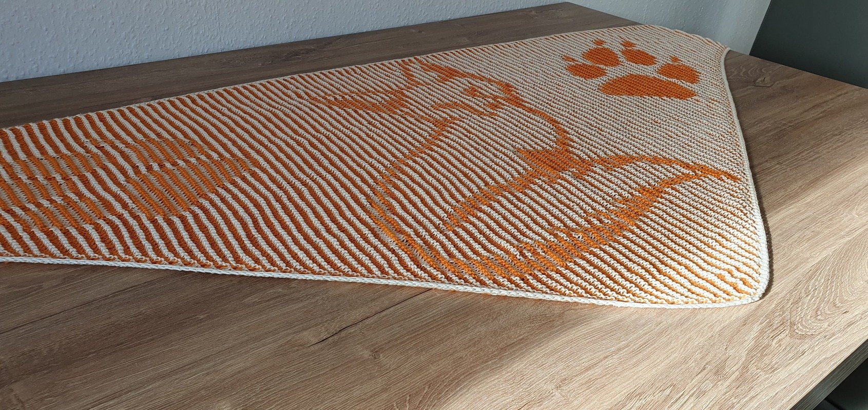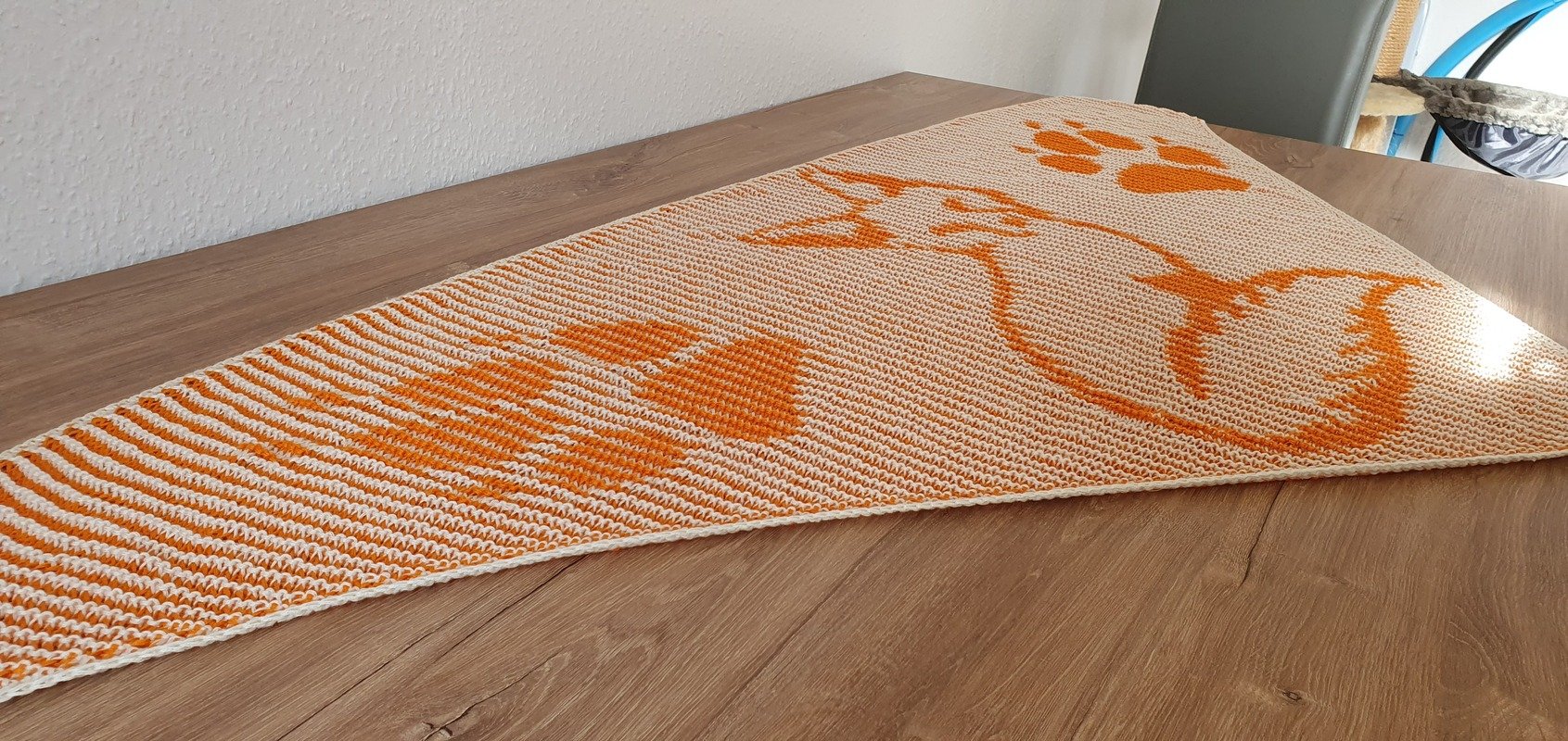 The finished shawl measures approximately 175 cm (width) x 78 cm (depth) in my version.