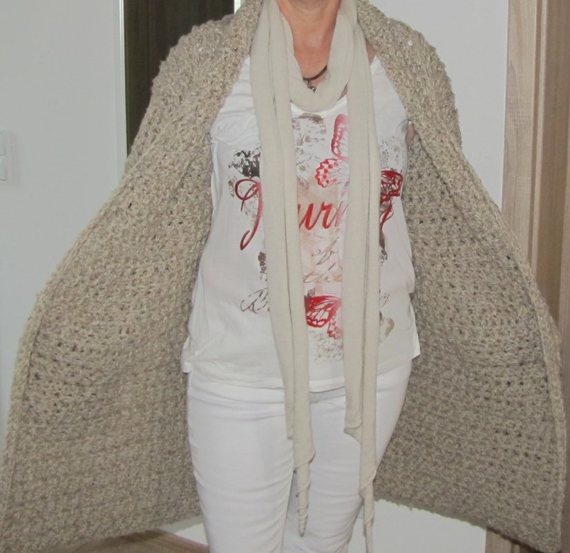 Die Anleitung ist für Gr. L / 42 (Körpergr. 170 cm) gemacht. Gehäkelt wurde mit einer Wolle der Nadelstärke 10 und einer Lauflänge von 30 m / 50g. Verbrauch ca. 2500 g.