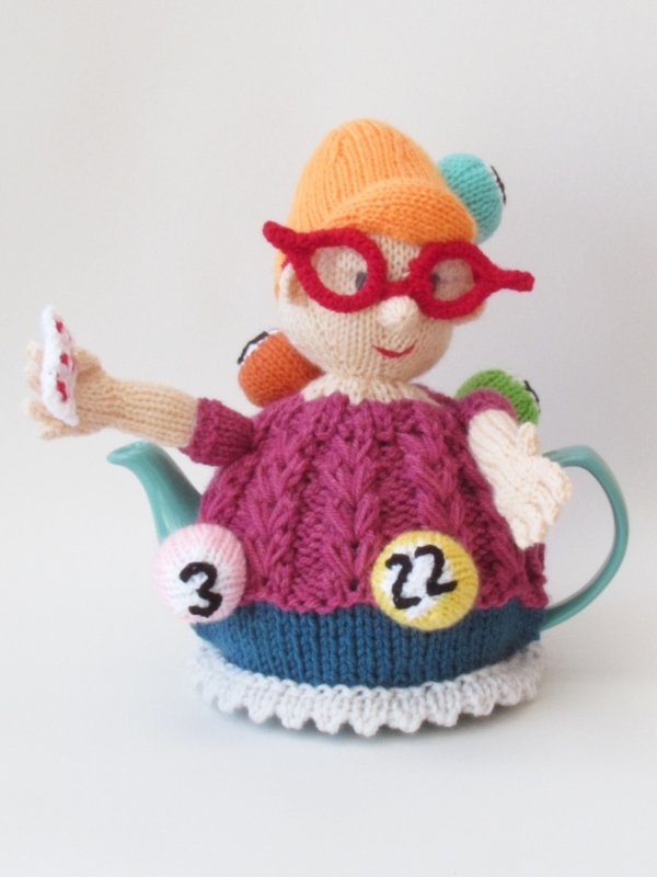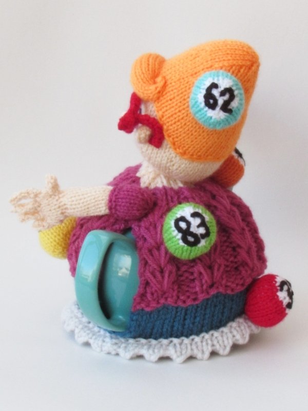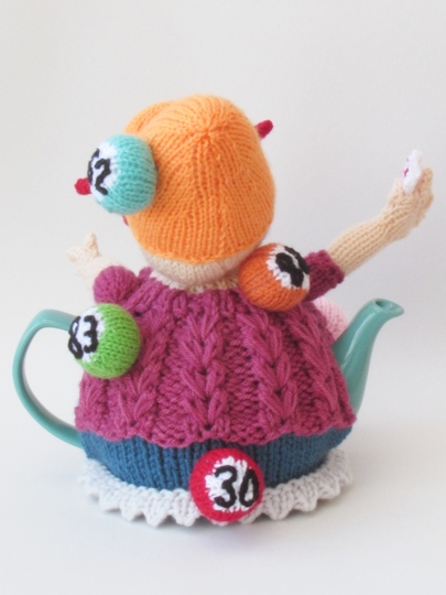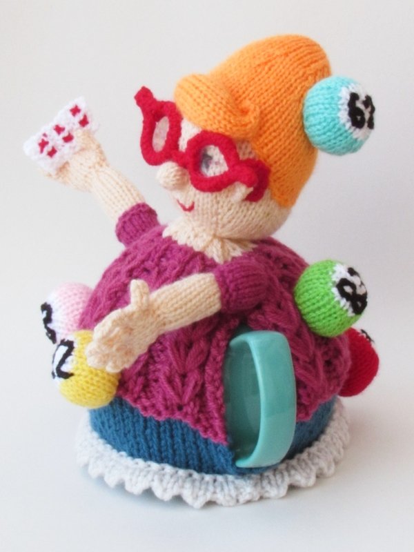 The Bingo tea cosy is a very stylish lady and she's clearly a winner. She has her arm raised, waving her bingo card in the air - I think she has a full house.