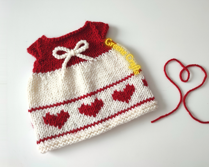 This cute dress with hearts looks great both on a knitted teddy bear and on a child's playdoll.