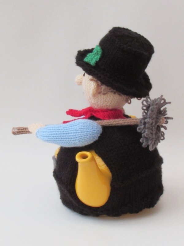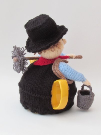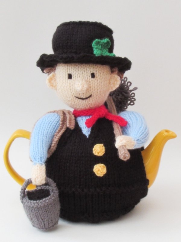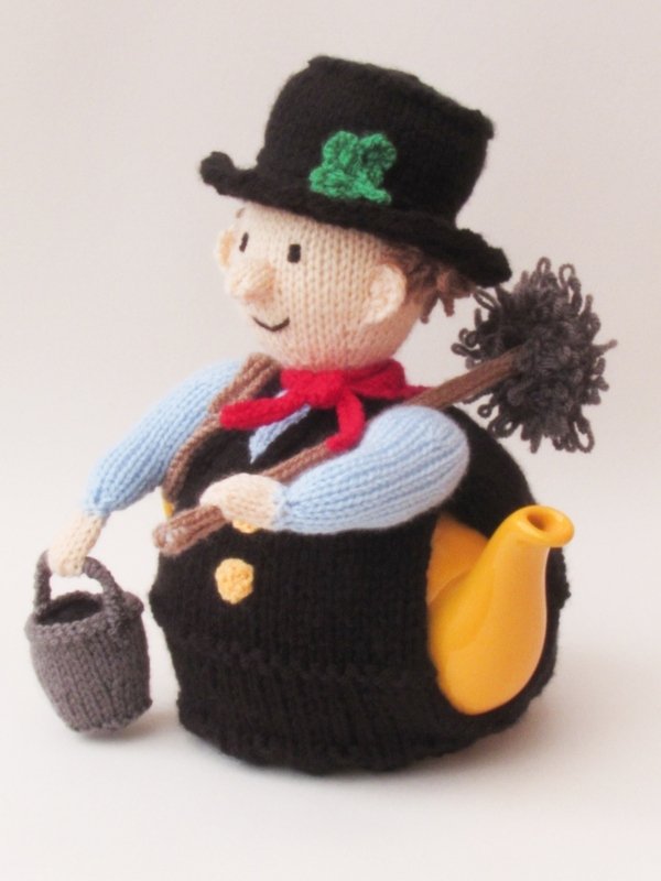 The lucky chimney sweep is a happy tea cosy in his top hat. He has got his sweeps brush with him and a bucket full of soot. The cute chimney sweep is wearing a waistcoat and top hat, adorned with a lucky shamrock. Around his neck he is wearing a red neckerchief to keep the soot from going down his neck.