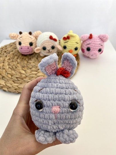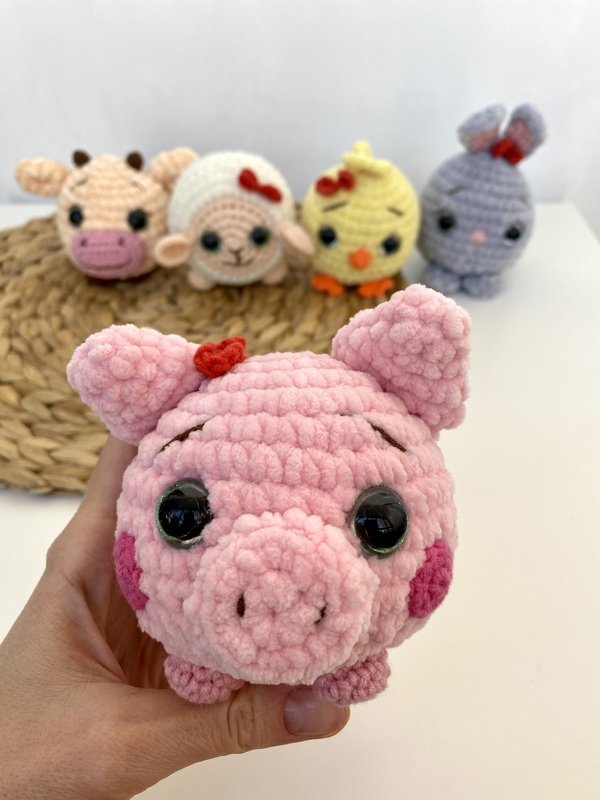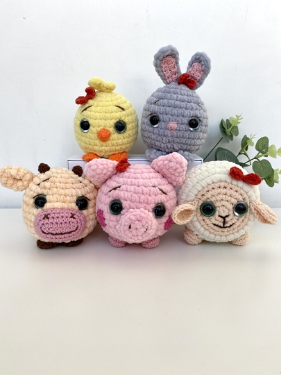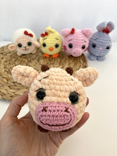 Crochet your own adorable little plush cow, bunny, sheep, pig or chicken toy in just a one hour!